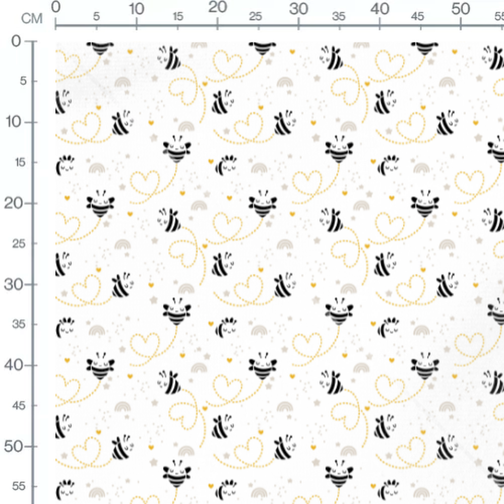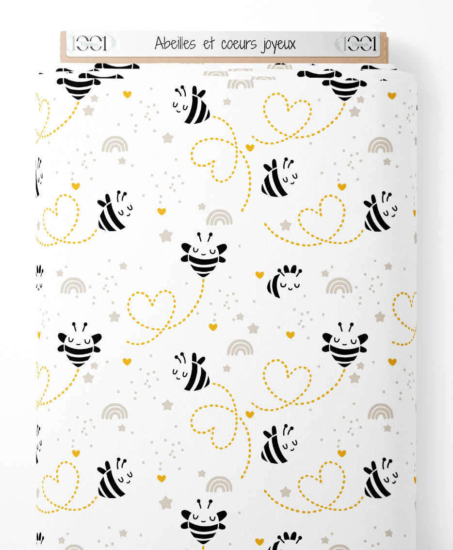 Les abeilles souriantes volent parmi des cœurs et des arcs-en-ciel. De petites étoiles grises ajoutent une touche de douceur au fond blanc.Les tissus