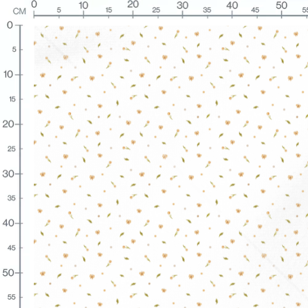 Les abeilles sont dessinées avec des détails fins et des ailes transparentes. Les fleurs sont petites avec des pétales orange clair. Les feuilles vertes ajoutent une touche de fraîcheur au motif. Les pois beige sont répartis de manière aléatoire sur le fond blanc.Les tissus