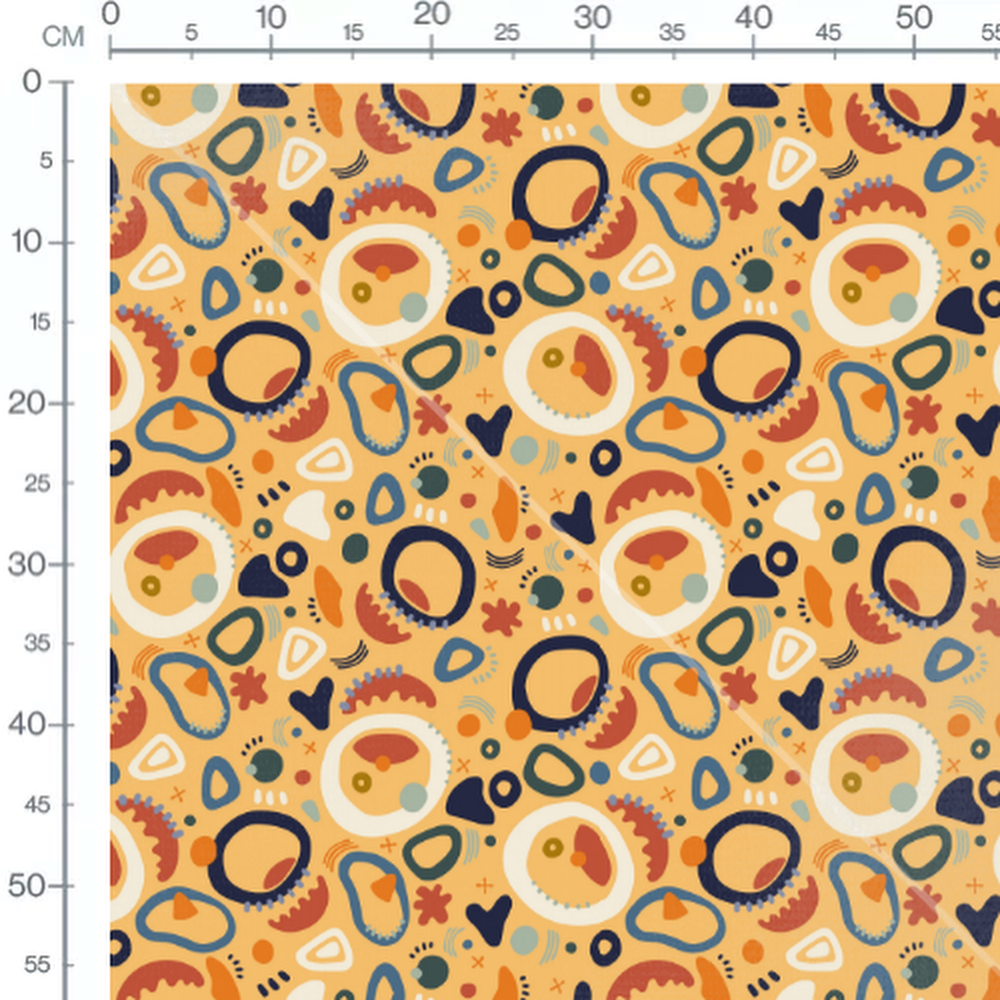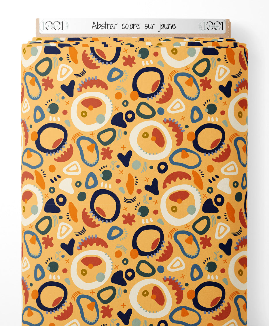 Les formes incluent des cercles, des arcs et des lignes ondulées. Les couleurs dominantes sont le bleu, le rouge, le blanc et le jaune. Des motifs irréguliers ajoutent une dynamique visuelle. Des touches de noir et d'orange complètent le design.Les tissus