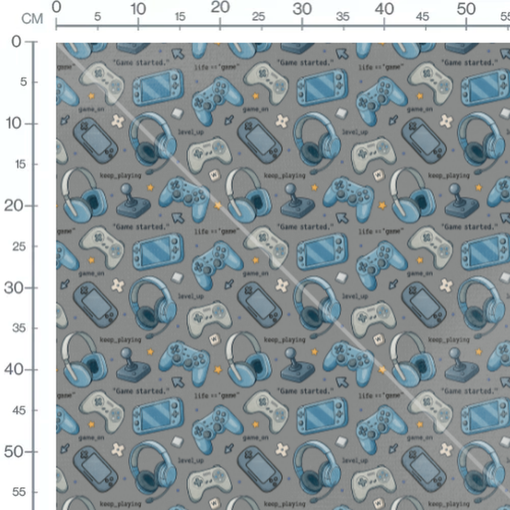 Les manettes et consoles sont illustrées dans différentes nuances de bleu. Des casques audio complètent le motif avec des détails en noir. Des petites étoiles orange ajoutent une touche de couleur vive.Les tissus