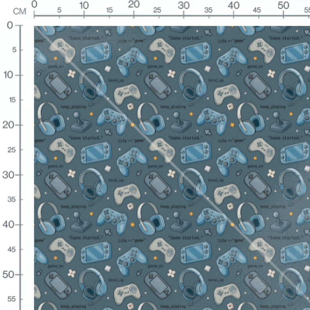 Texte lié aux jeux vidéo en noir. Petits éléments de jeu comme des boutons et des flèches.Les tissus
