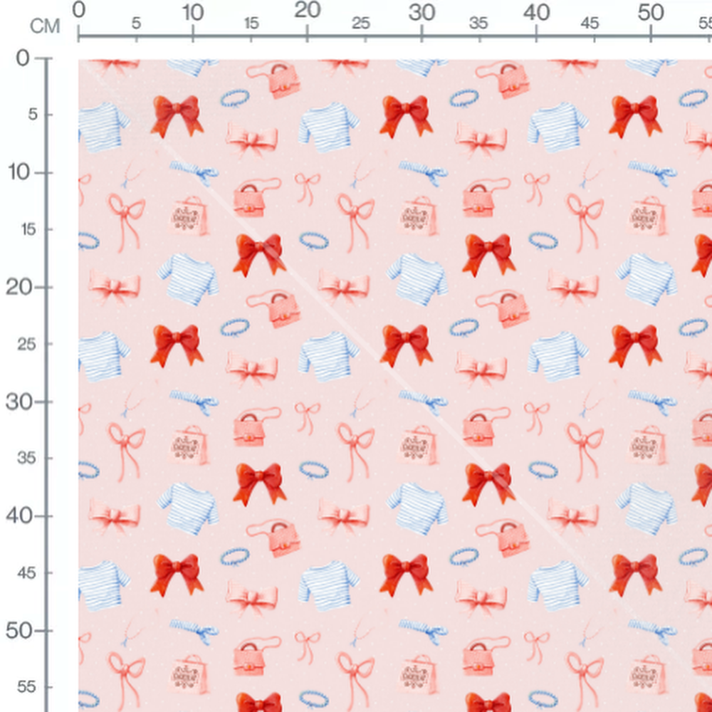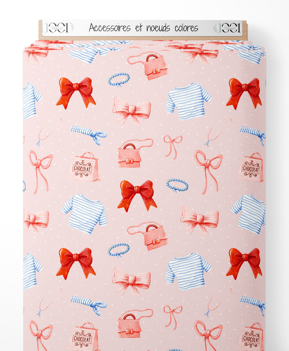 Les nœuds sont accompagnés de sacs à main roses et de bracelets bleus. Des motifs de rayures bleues ajoutent une touche de contraste. Le fond rose est parsemé de petits points blancs.Les tissus