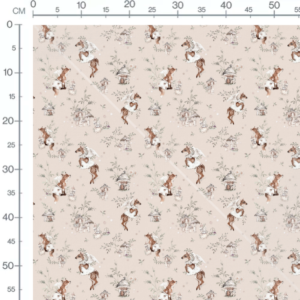 Les animaux ailés sont entourés de feuillages verts. De petites maisons en forme de champignons ajoutent une touche féerique. Des points colorés parsèment le fond beige.Les tissus