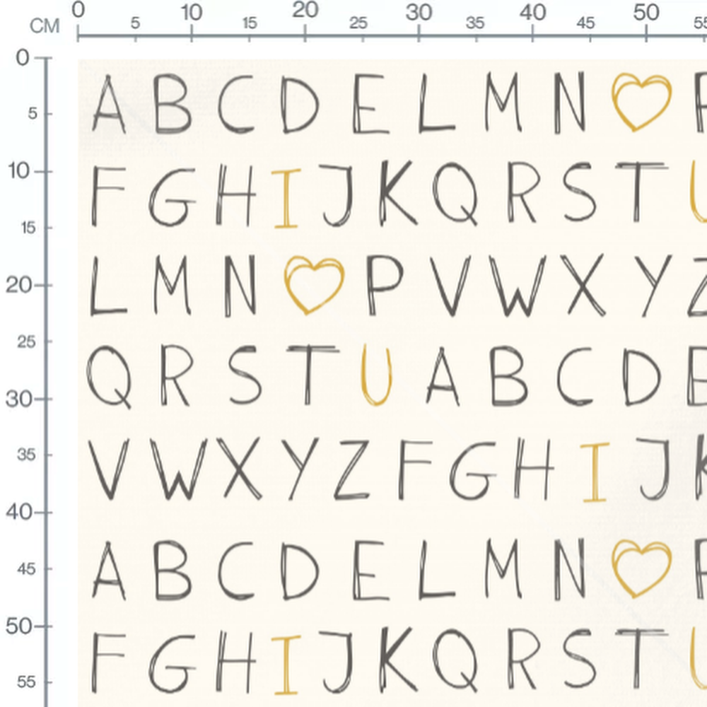 Les lettres sont dessinées dans un style manuscrit. Certaines lettres sont en doré, ajoutant une touche de contraste. Les cœurs dorés apportent une note décorative au motif.Les tissus
