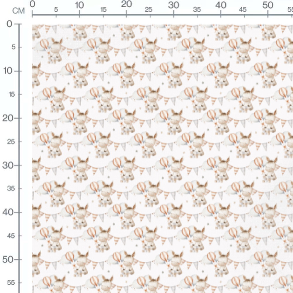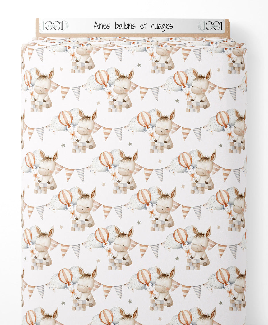 Les ânes tiennent des ballons rayés beige et blanc. Des nuages doux et des guirlandes rayées décorent le fond.Les tissus
