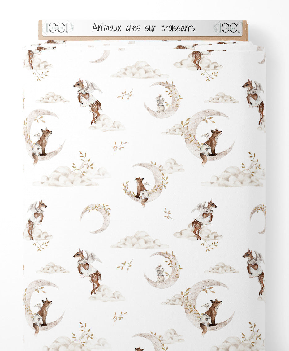 Les animaux ailés sont posés sur des croissants de lune. Les nuages sont dispersés autour des lunes. Les feuilles beige ajoutent une touche délicate au motif.Les tissus