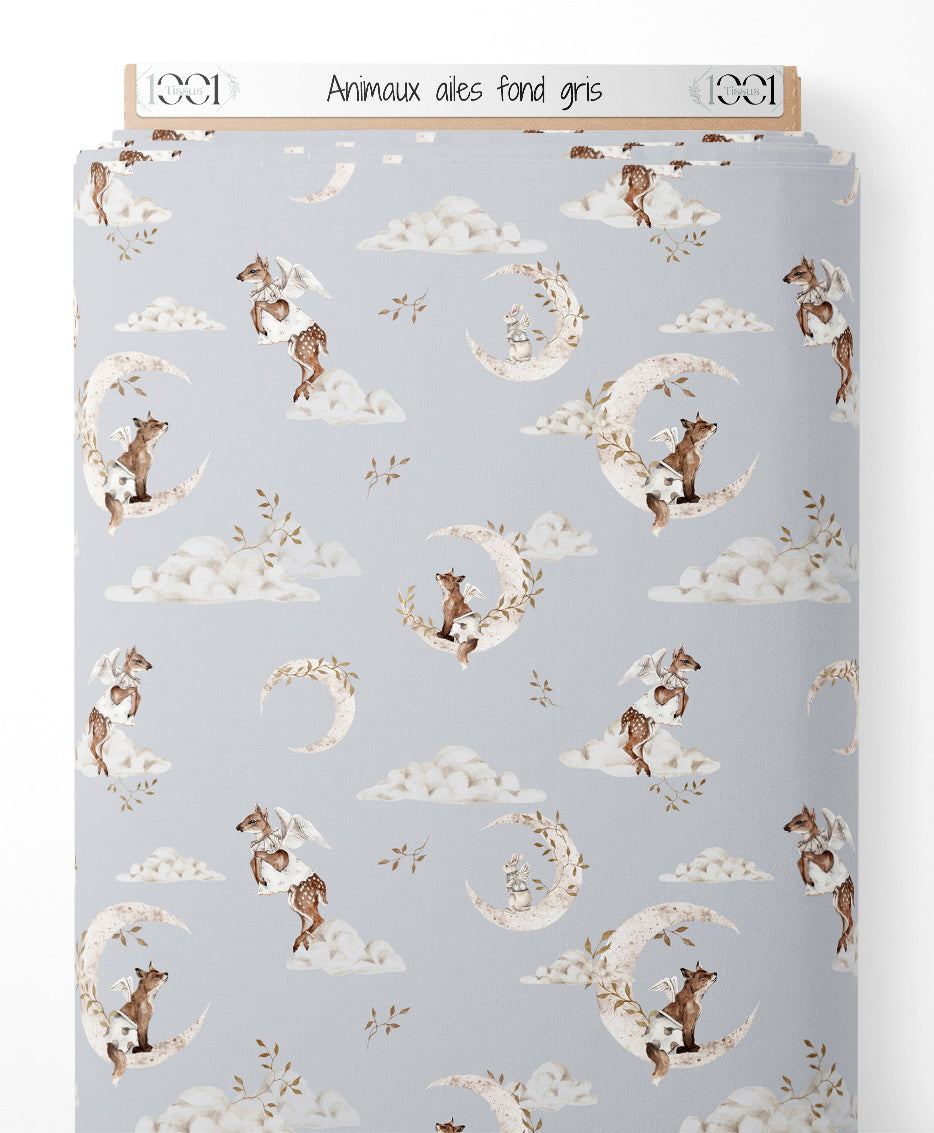 Les animaux ailés incluent des cerfs et des renards. Les lunes sont décorées de motifs subtils et les nuages sont dispersés. De petites branches ajoutent une touche naturelle au motif.Les tissus