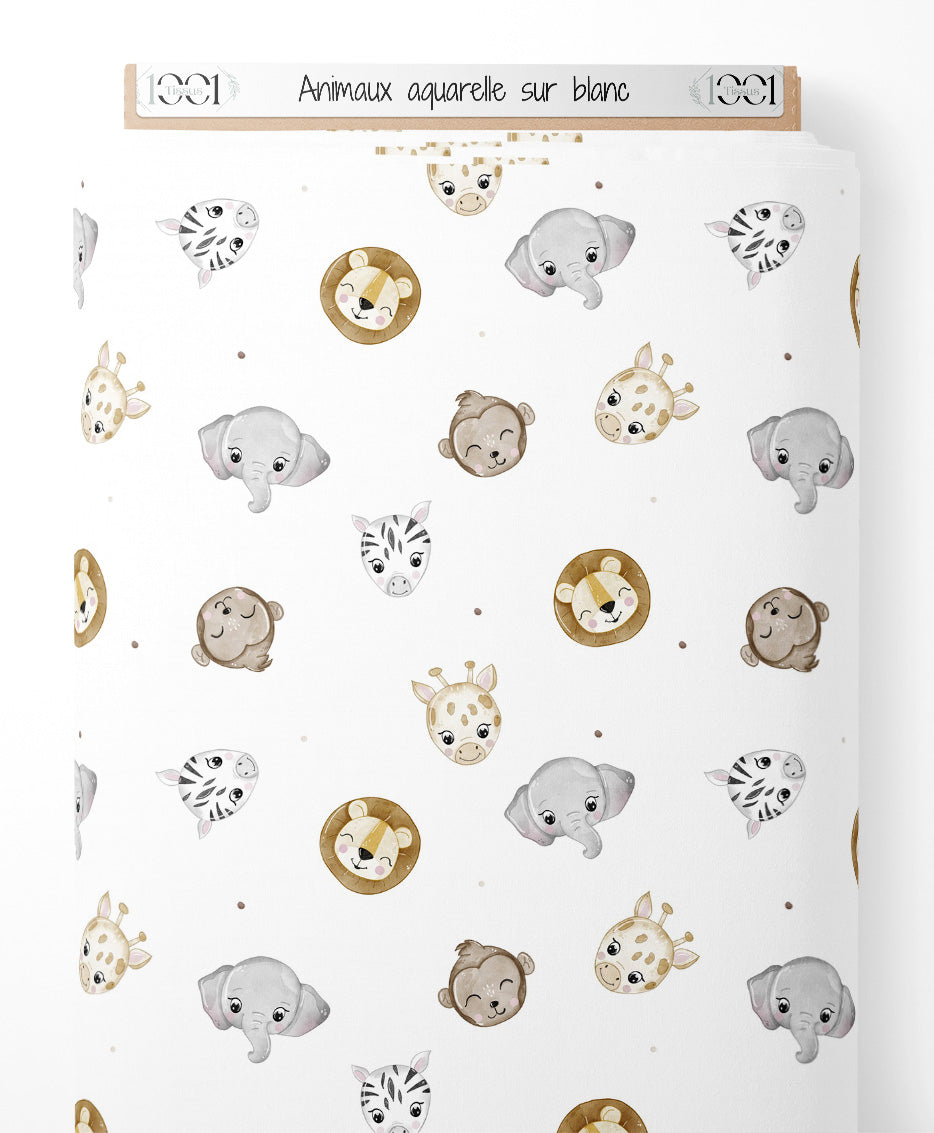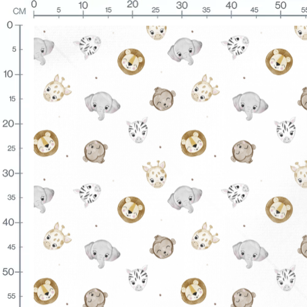 Les têtes d'animaux sont dessinées avec des expressions amicales. Les couleurs pastel ajoutent une touche douce et apaisante. Les petits points dispersés complètent le motif.Les tissus