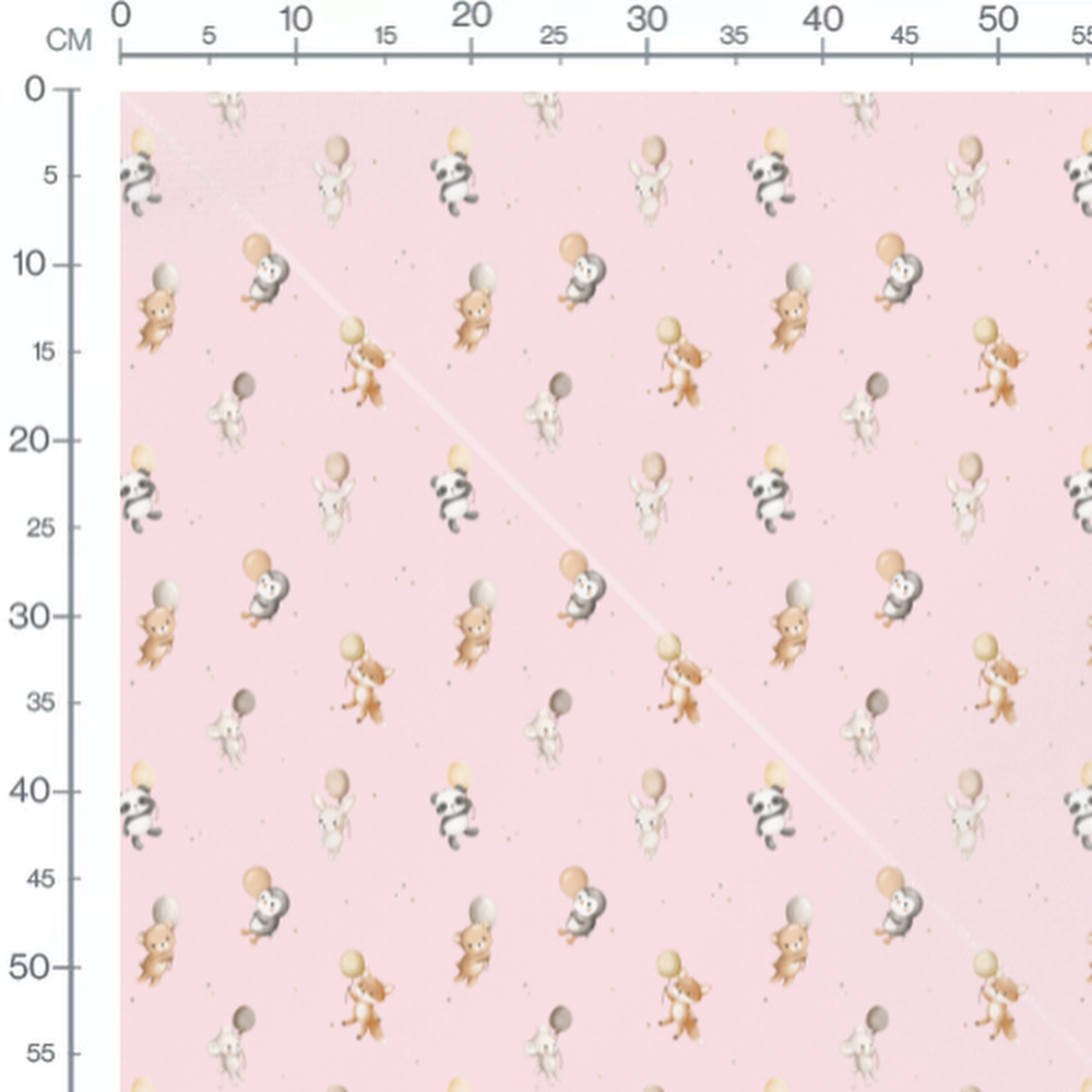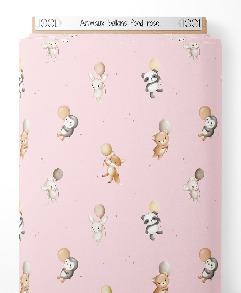 Les animaux tiennent des ballons de différentes couleurs pastel. Le fond rose est parsemé de petits points gris et beiges.Les tissus