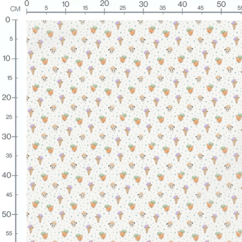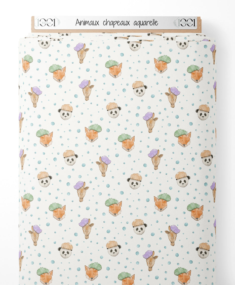 Les pandas portent des chapeaux beiges. Les renards ont des chapeaux verts. Les cerfs arborent des chapeaux violets. Les points bleus ajoutent une touche ludique au motif.Les tissus