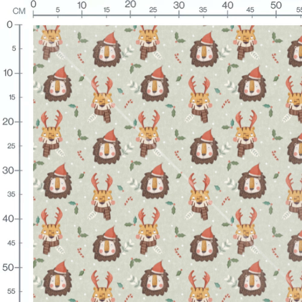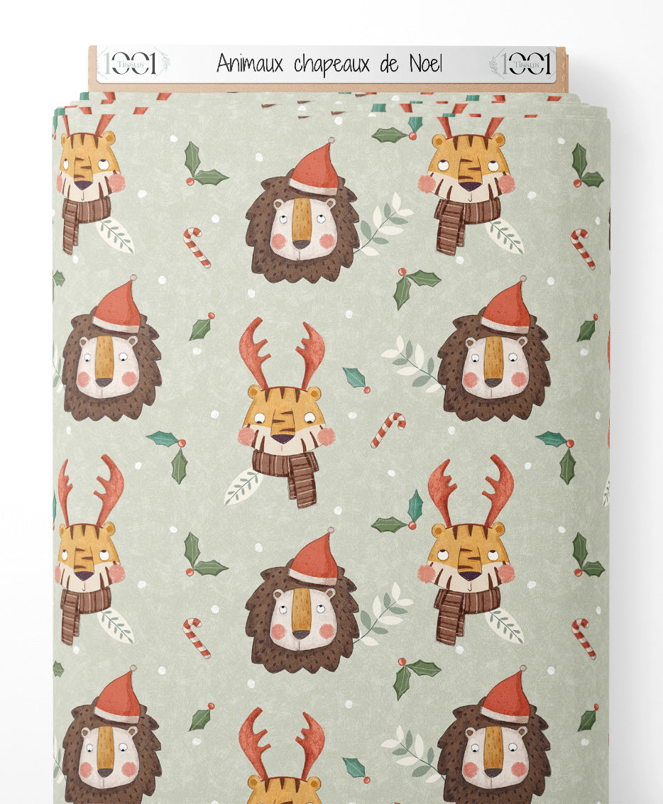 Les tigres portent des bois de renne et des écharpes marron. Les lions ont des chapeaux de Noël rouges. Des petites baies rouges accompagnent les feuilles de houx.Les tissus