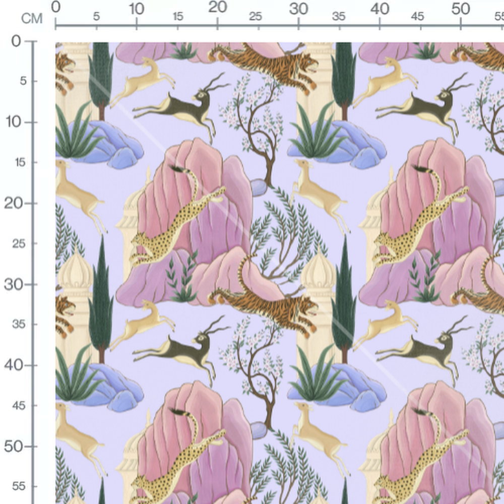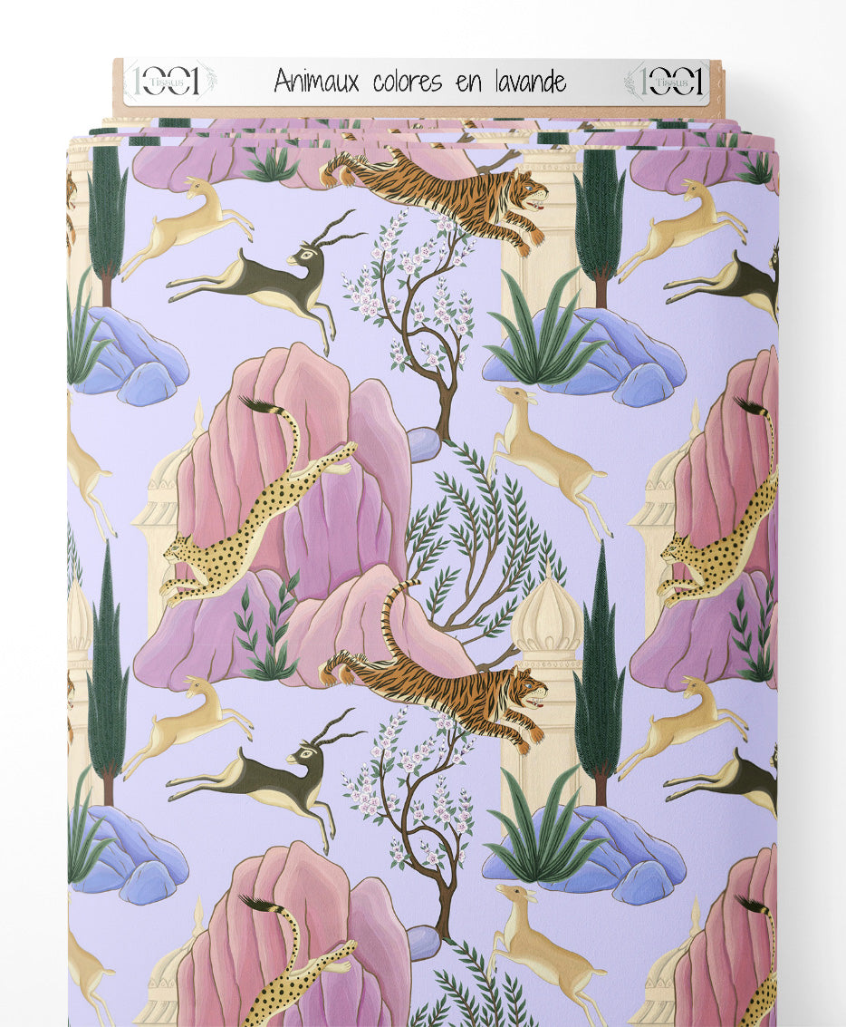 Tigres, antilopes et guépards parmi des montagnes roses. Arbres fleuris et plantes vertes complètent le motif. Fond lavande doux et apaisant.Les tissus