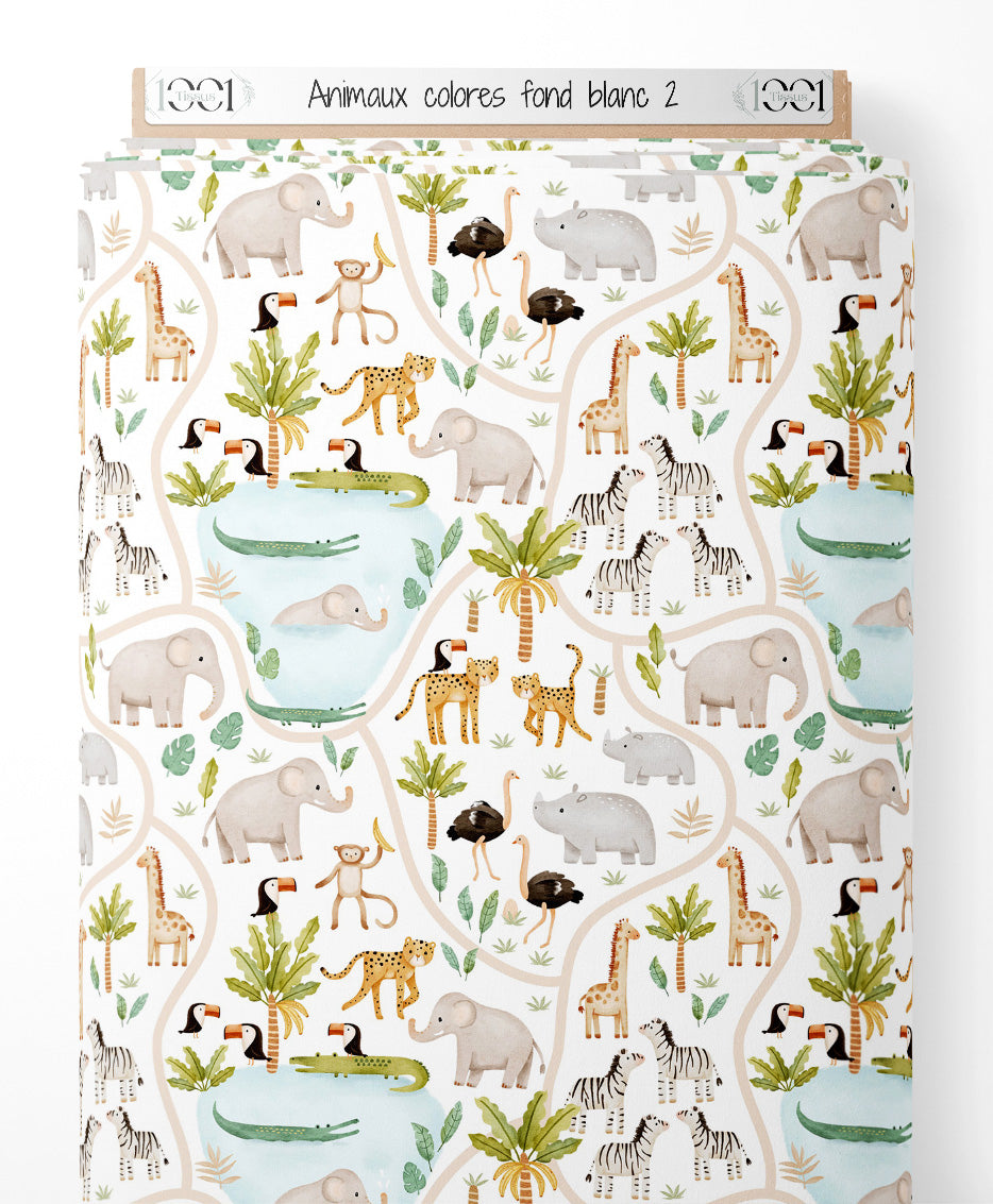 Des toucans et des guépards ajoutent de la diversité au motif. Les palmiers et les plantes vertes complètent le décor. Les animaux sont représentés de manière ludique et colorée.Les tissus