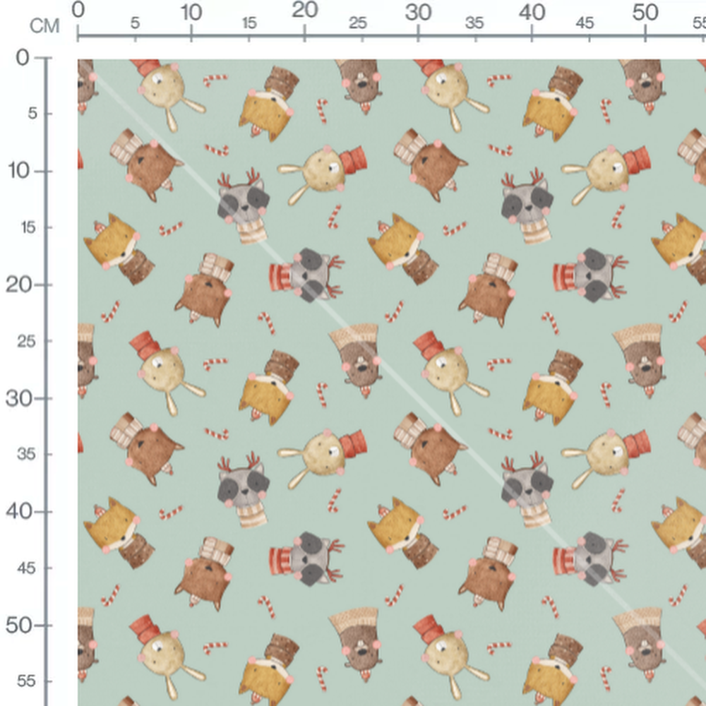 Les animaux portent des écharpes rayées de différentes couleurs. Les cannes à sucre ajoutent une touche festive au motif. Les animaux ont des expressions joyeuses et sont dessinés dans un style enfantin.Les tissus