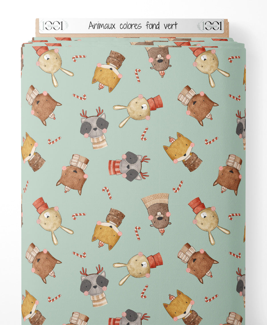 Tissu - Animaux colorés sur fond vert