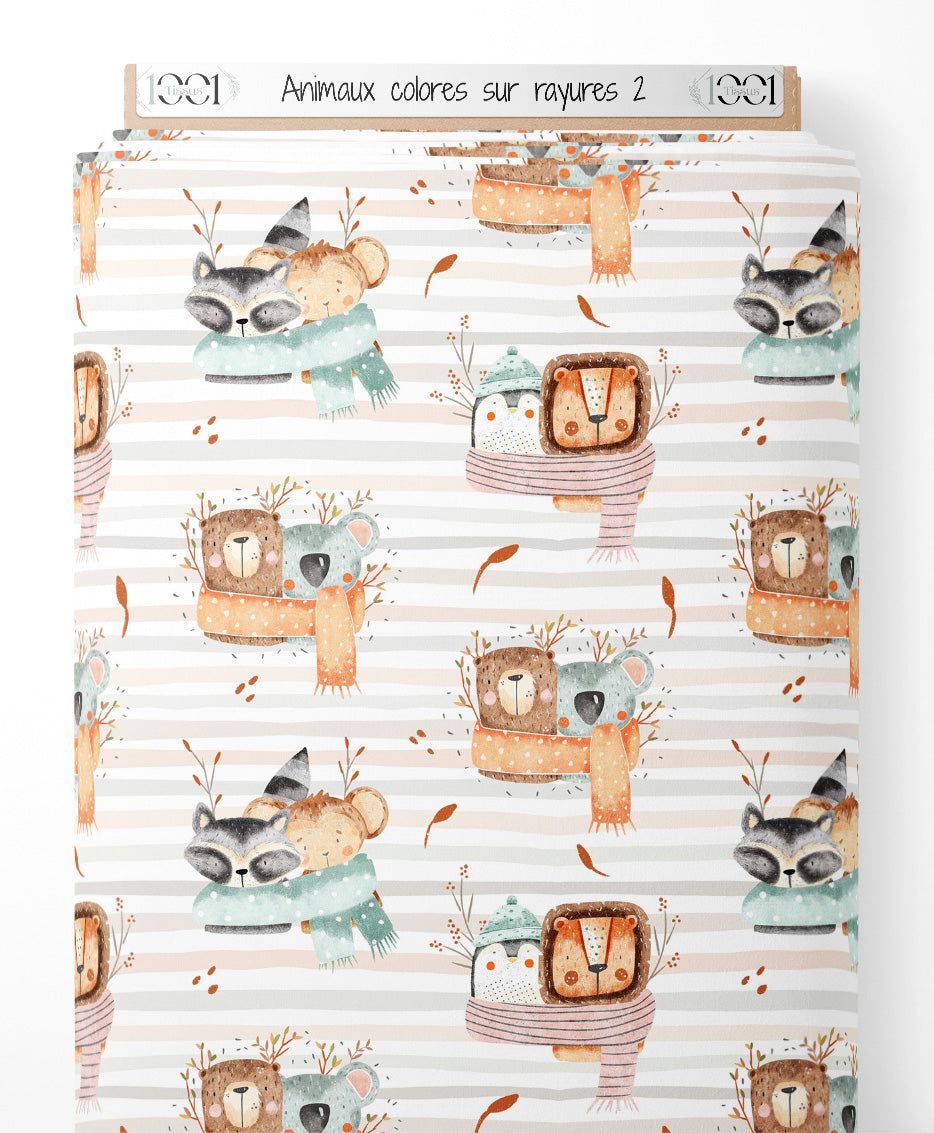 Les animaux incluent un raton laveur, un ours, un lion, un pingouin et un koala. Chaque animal porte une écharpe de couleur différente, ajoutant une touche de couleur vive. Les feuilles et branches autour des animaux sont de couleur orange et marron.Les tissus