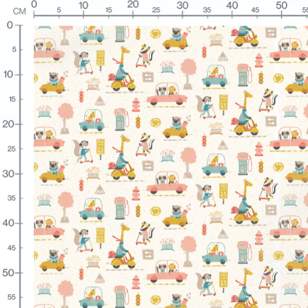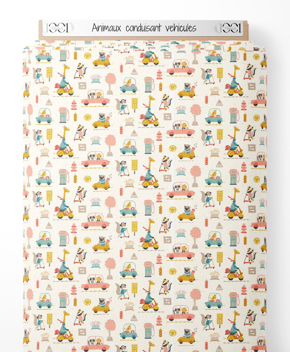 Les animaux incluent un chien, un raton laveur et un écureuil. Les véhicules sont de couleurs pastel comme le rose et le jaune. Des éléments comme des panneaux de signalisation et des arbres complètent le motif.Les tissus