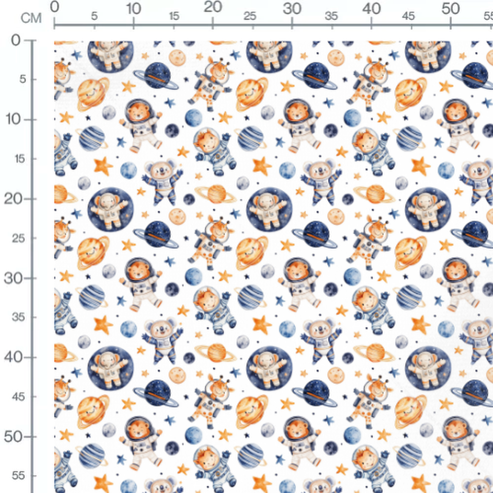 Les animaux incluent un lion, un ours et une girafe en combinaisons spatiales. Les planètes sont de différentes tailles et couleurs, incluant des anneaux. Les étoiles varient en taille et en couleur, ajoutant une touche ludique au motif.Les tissus