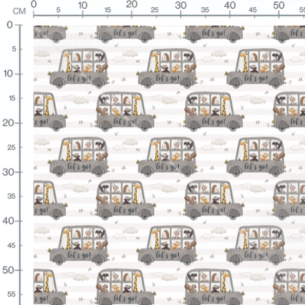 Une girafe, un lapin, un raton laveur et un écureuil sont visibles à travers les fenêtres du bus. Le bus est décoré avec l'inscription 'let's go!'. De petits nuages blancs et des fleurs grises complètent le motif.Les tissus