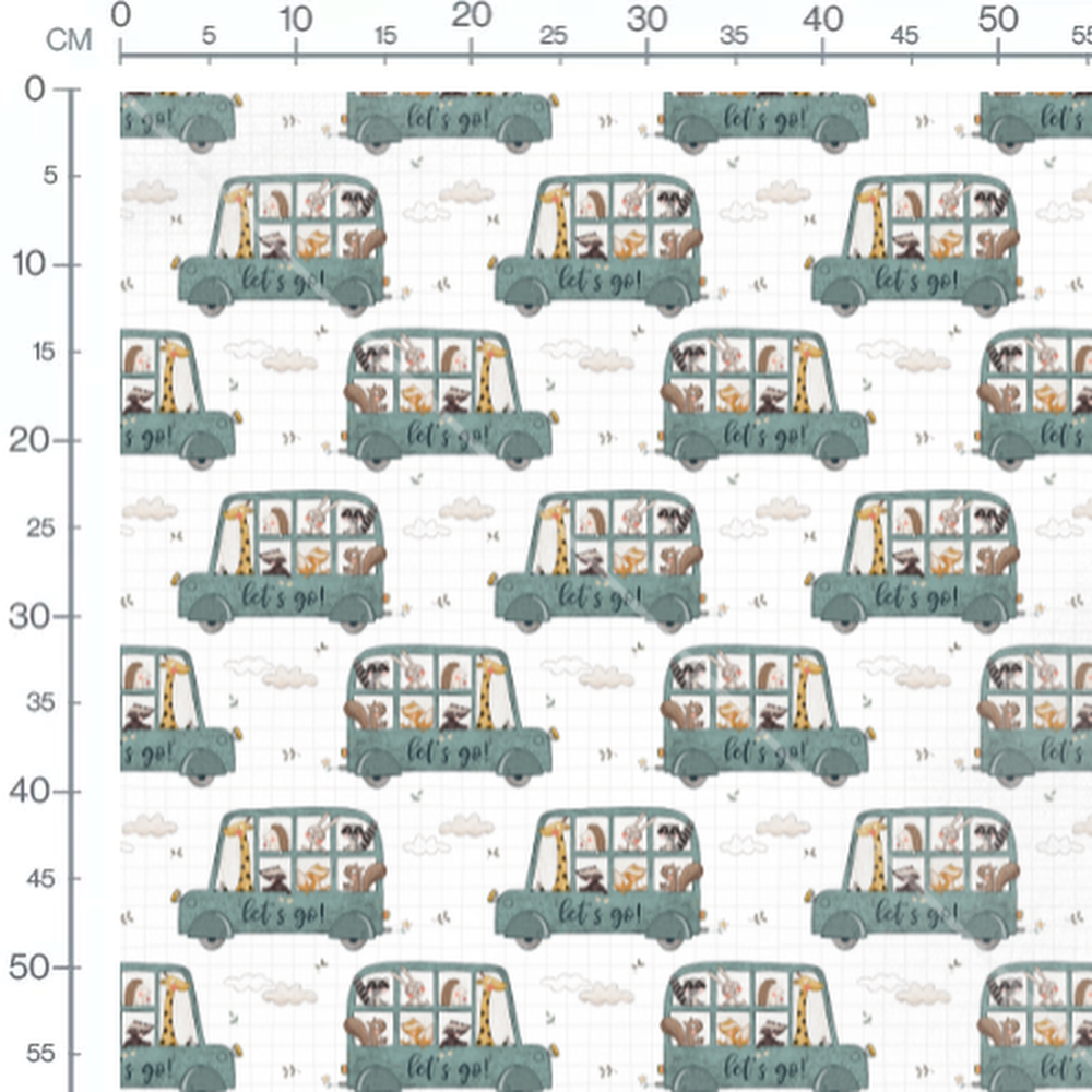 Giraffe, lapin, raton laveur et écureuil visibles à travers les fenêtres du bus. Le bus est décoré avec l'inscription 'let's go!'. Petits nuages blancs et fleurs grises dispersés sur le fond.Les tissus