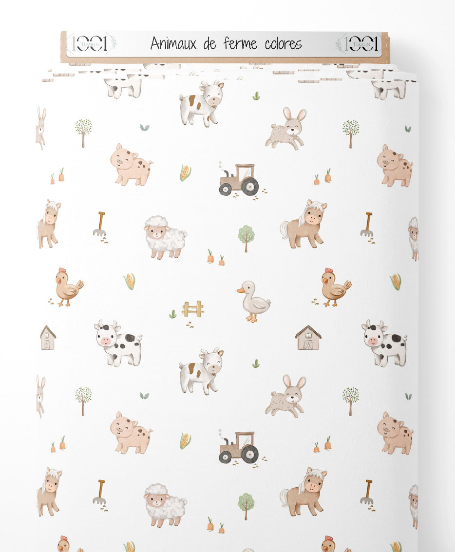 Lapins, vaches, cochons, moutons et chevaux en dessins doux. Poules et canards ajoutent une touche colorée. Petits arbres et carottes complètent le motif. Tracteur et outils de ferme dispersés. Éléments de ferme comme clôtures et épis de maïs.Les tissus