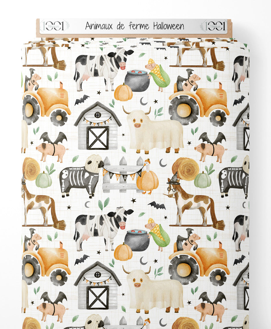 Vache, mouton, cochon et cheval avec accessoires d'Halloween. Tracteur orange et grange décorée. Étoiles et lunes grises ajoutent une touche nocturne.Les tissus