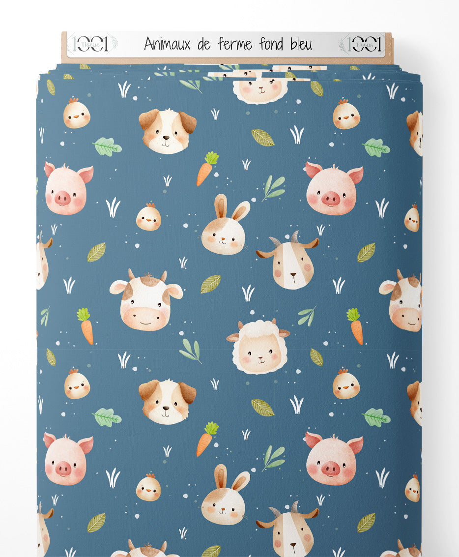 Tissu - Animaux de ferme sur fond bleu