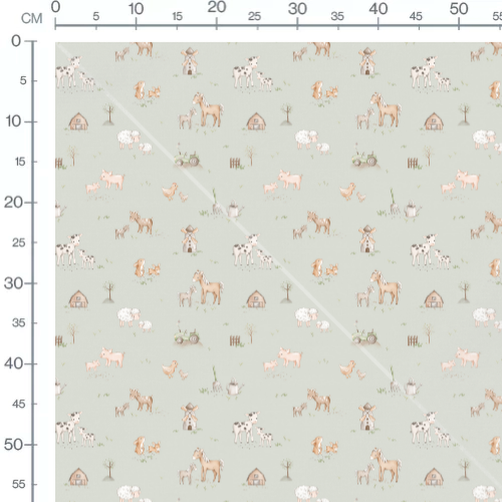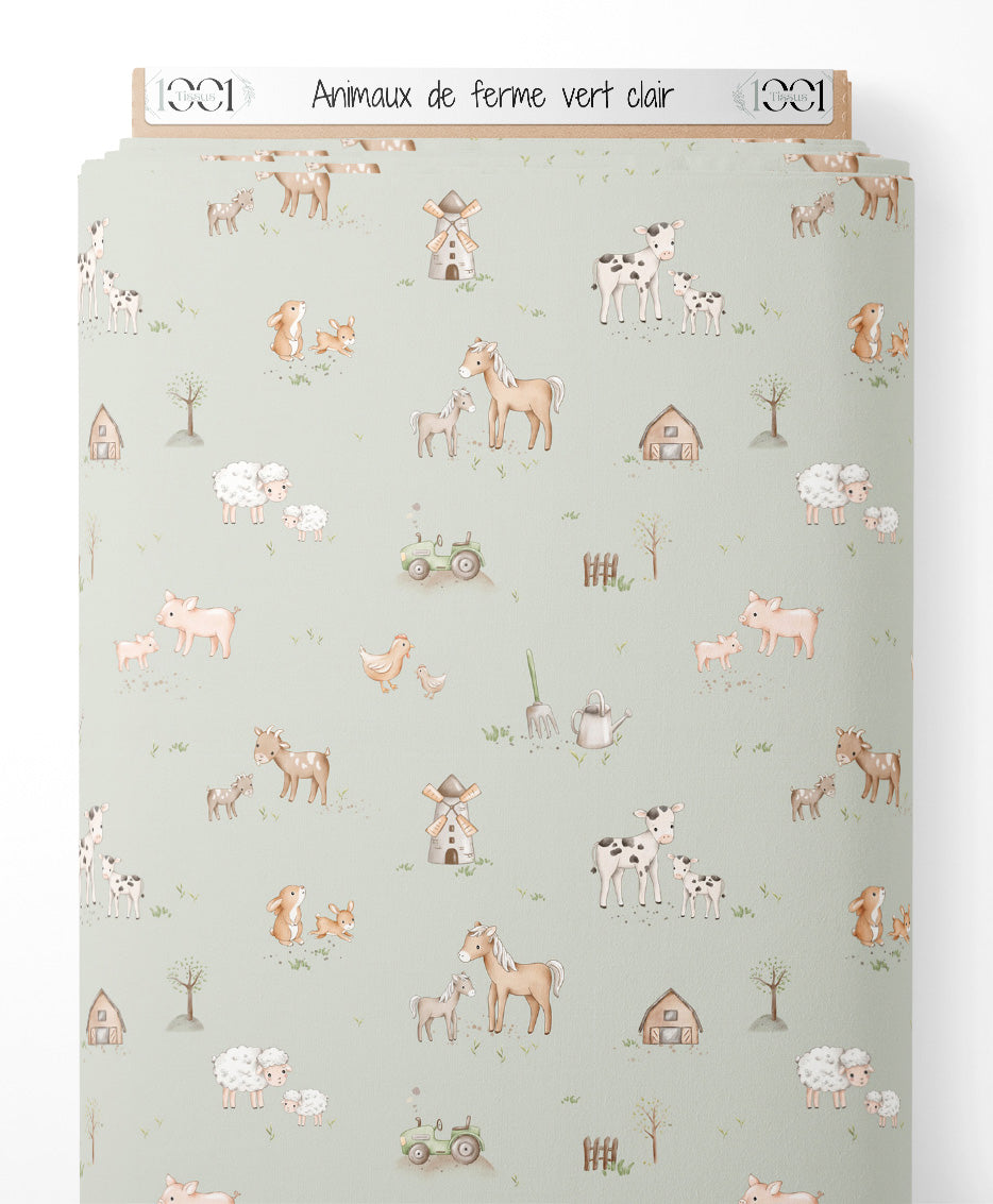 Un moulin à vent et une maison complètent le motif. Des arbres et des clôtures ajoutent des détails au paysage. Un lapin et un âne sont également présents. Des outils de jardinage sont dispersés sur le fond.Les tissus