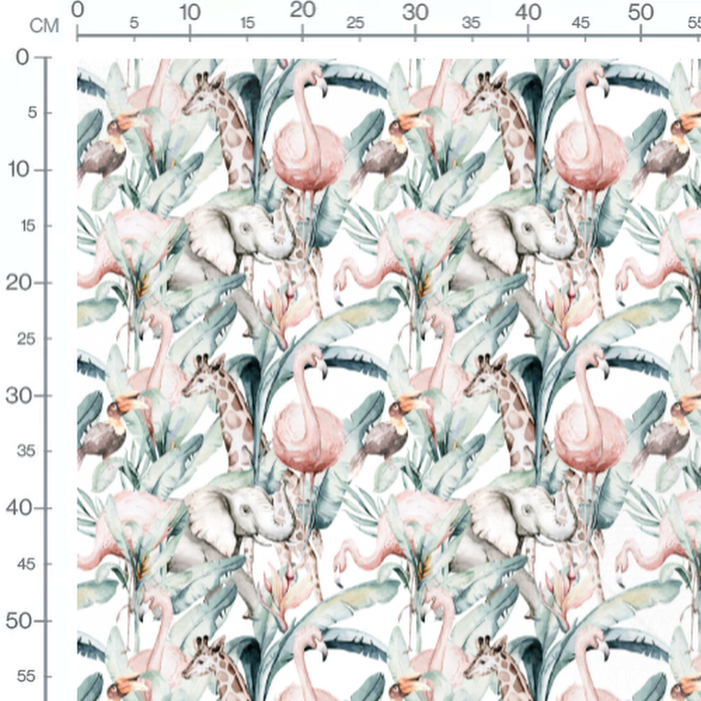 Les éléphants sont dessinés avec des nuances de gris doux. Les girafes présentent des taches brunes distinctes. Les flamants roses se tiennent parmi les feuilles vertes. Un toucan coloré se cache parmi les plantes tropicales. Le fond blanc met en valeur les couleurs pastel des animaux et des plantes.Les tissus