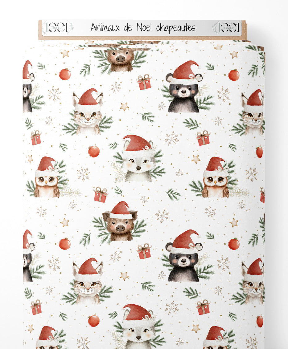 Les animaux portent des chapeaux de Noël rouges. Des boules rouges et des étoiles dorées décorent le fond. Des branches de sapin vertes ajoutent une touche festive. De petits cadeaux rouges sont éparpillés.Les tissus