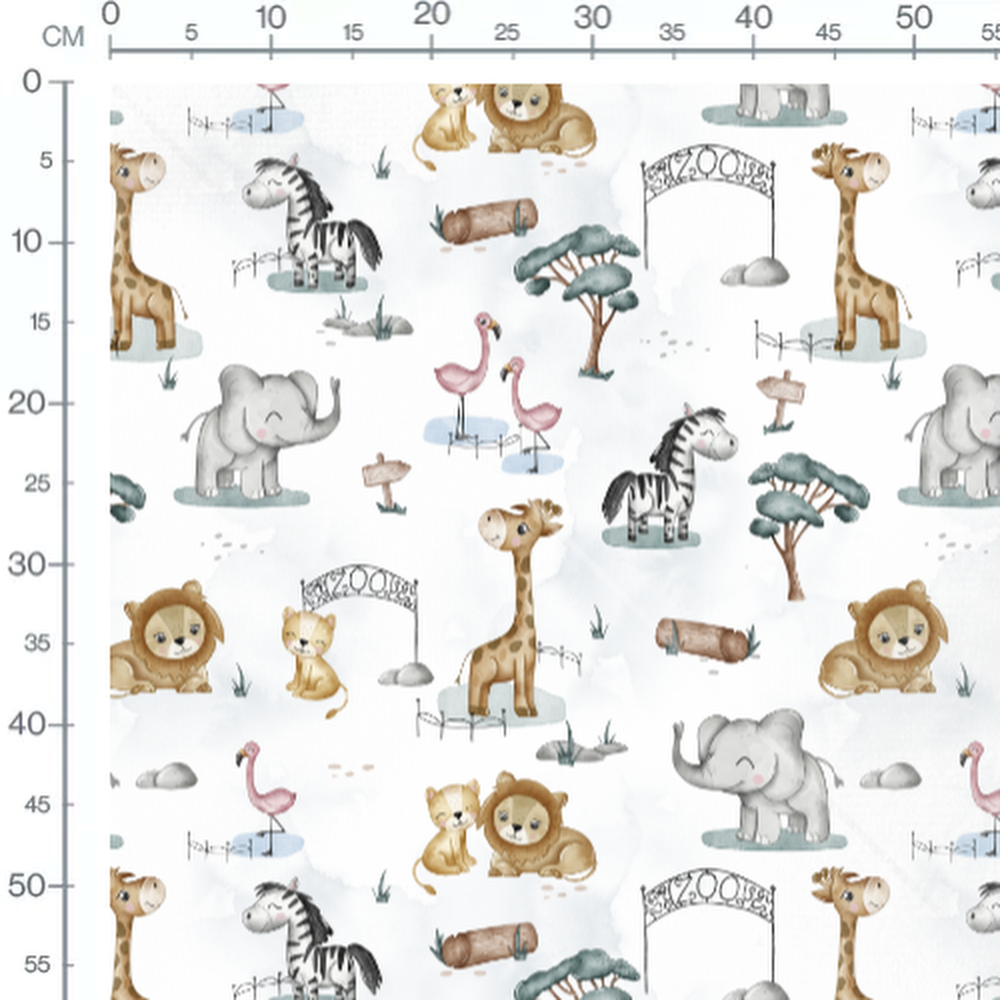 Les animaux sont entourés de petits éléments de zoo comme des panneaux et des barrières. Les couleurs sont douces avec des tons pastel. Les arbres ajoutent une touche de verdure au motif.Les tissus