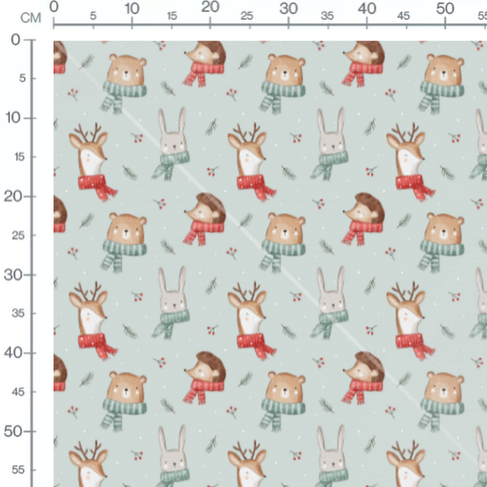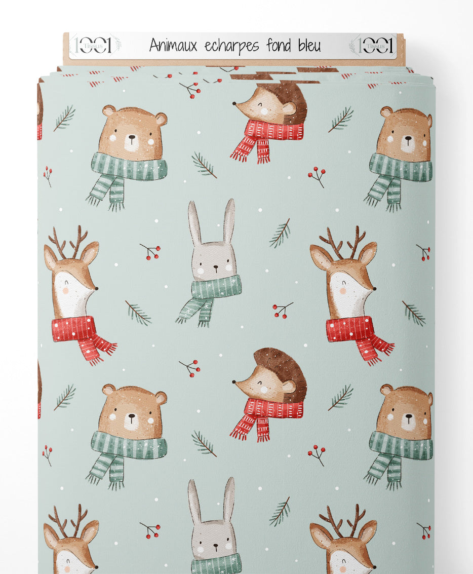 Les animaux portent des écharpes rouges et vertes. Le fond bleu clair est parsemé de petites baies rouges et de branches de sapin. Les animaux incluent un ours, un cerf, un lapin et un hérisson. De petits points blancs évoquent la neige.Les tissus