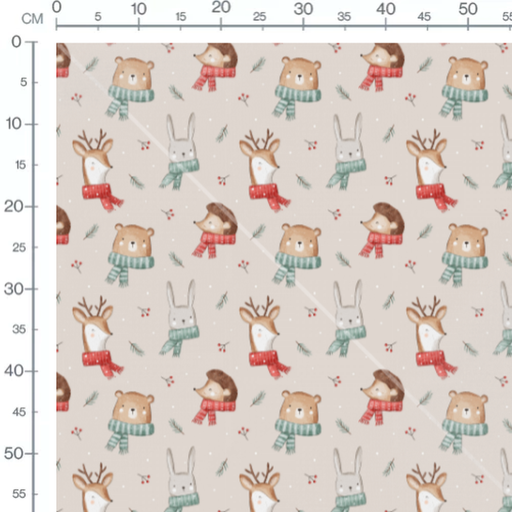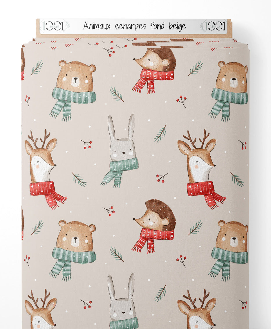 Un ours, un cerf, un lapin et un hérisson portent des écharpes rouges et vertes. De petites branches de sapin et des baies rouges ajoutent une touche festive. De légers points blancs évoquent la neige sur le fond beige.Les tissus