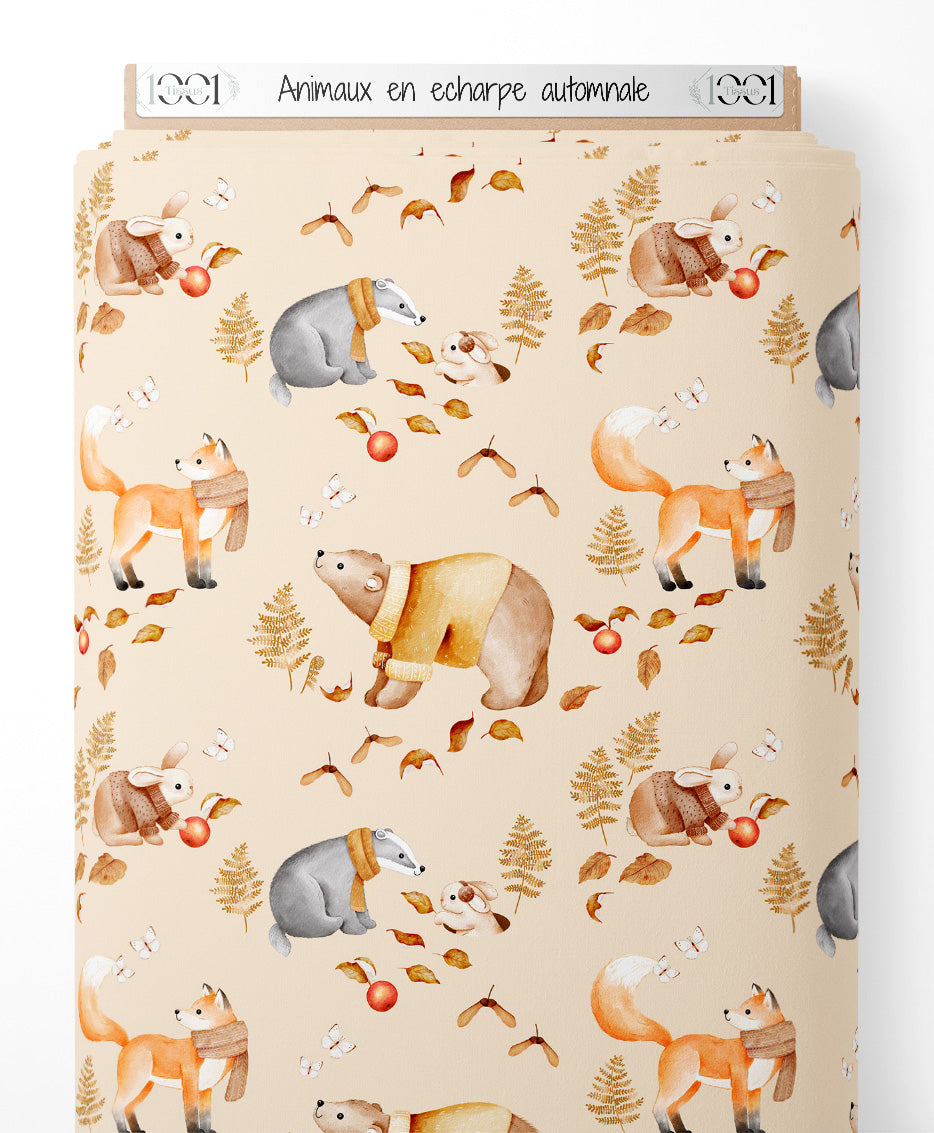 Les animaux portent des écharpes et sont entourés de feuilles d'automne. Des pommes rouges et des fougères complètent le motif. Le fond beige met en valeur les couleurs chaudes des éléments.Les tissus
