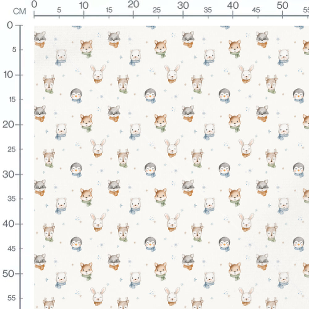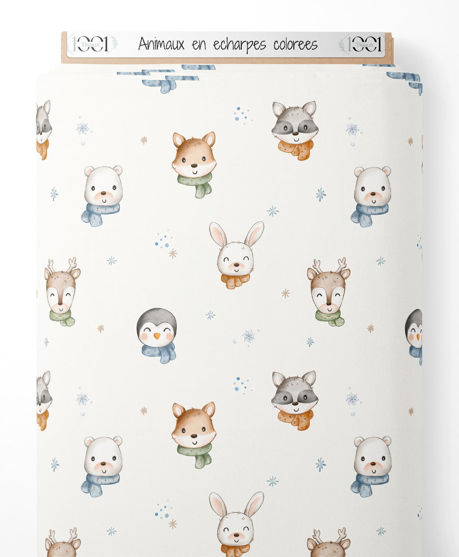 Les animaux portent des écharpes de différentes couleurs comme bleu, vert et orange. On trouve un raton laveur, un renard, un ours, un lapin, un pingouin et un cerf. De petits flocons de neige et des points ajoutent une touche hivernale au motif.Les tissus