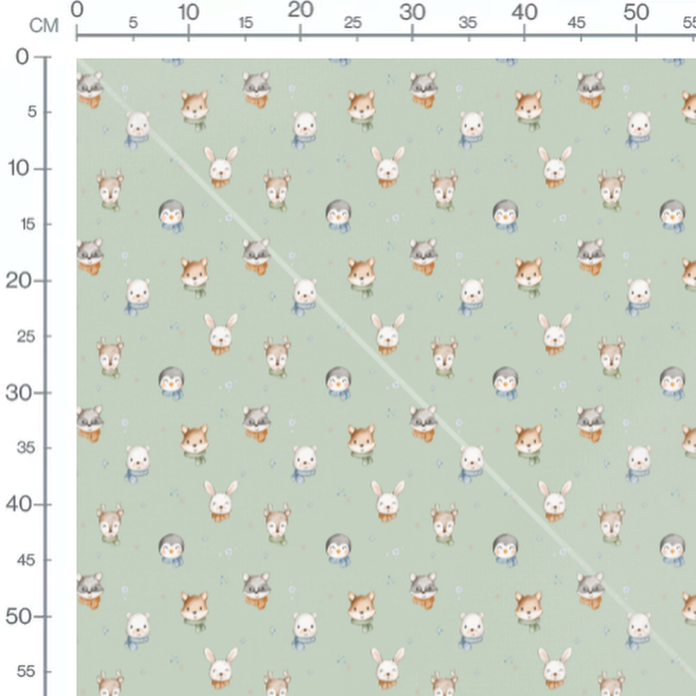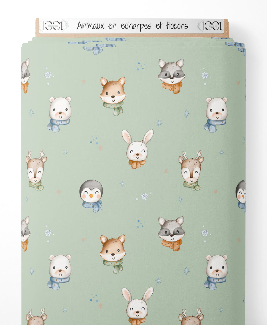 Un raton laveur, un ours, un renard, un cerf, un lapin et un pingouin portent des écharpes de différentes couleurs. De petits flocons de neige et des points colorés complètent le motif.Les tissus