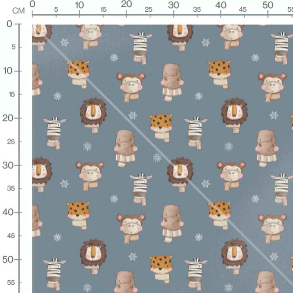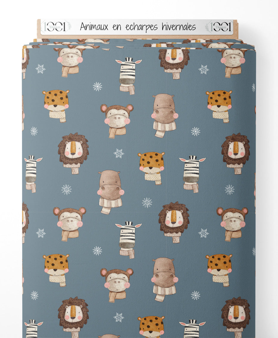 Les animaux incluent un lion, un zèbre, un hippopotame, un singe et un léopard. Chaque animal porte une écharpe beige. Les flocons de neige ajoutent une touche hivernale au motif.Les tissus