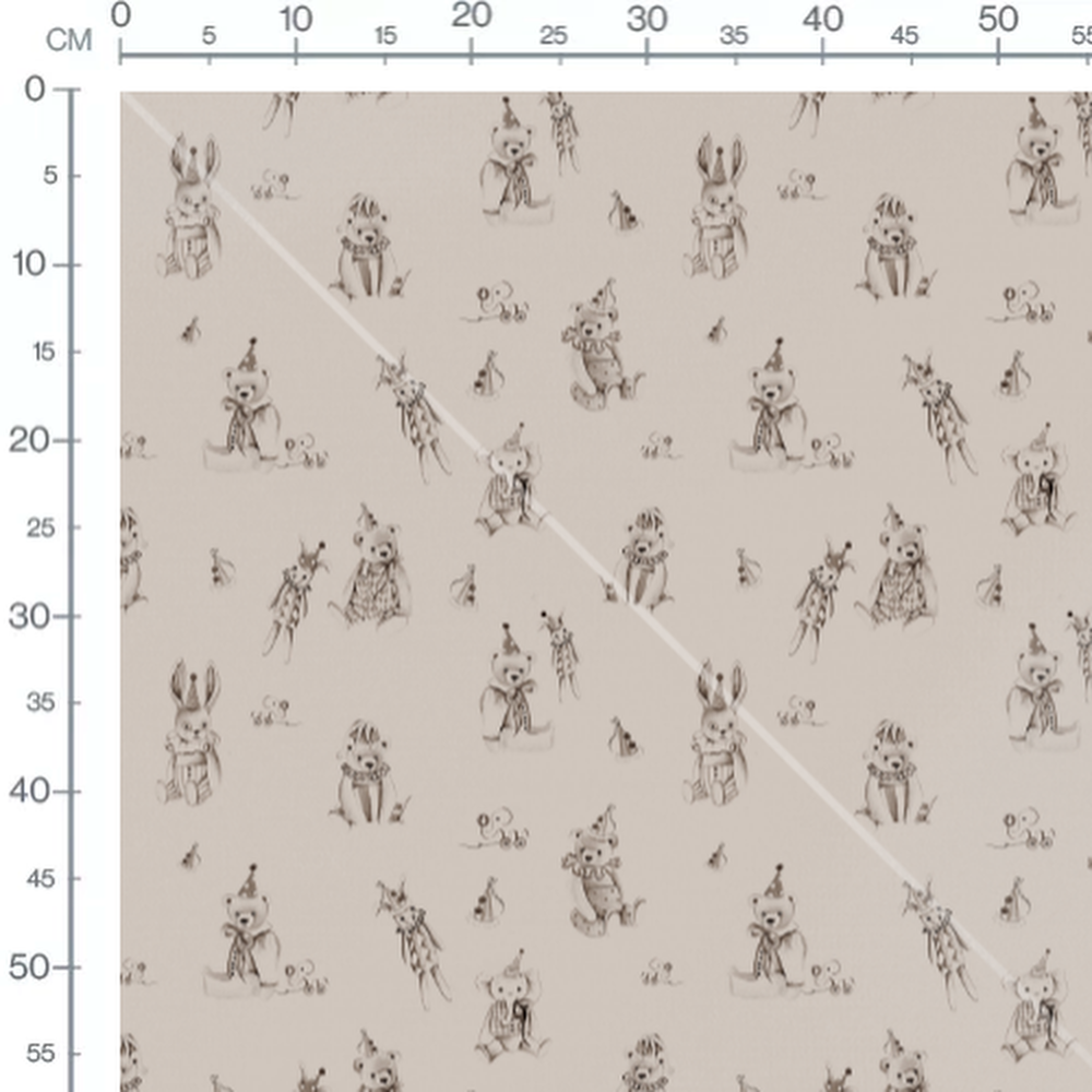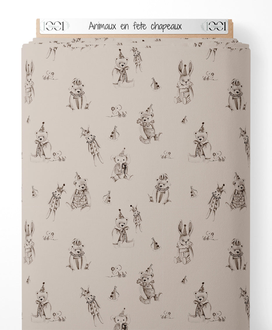 Les animaux portent des chapeaux pointus et des vêtements festifs. Les lapins et les ours sont dessinés dans des tons bruns. Les petites souris ajoutent une touche ludique au motif.Les tissus