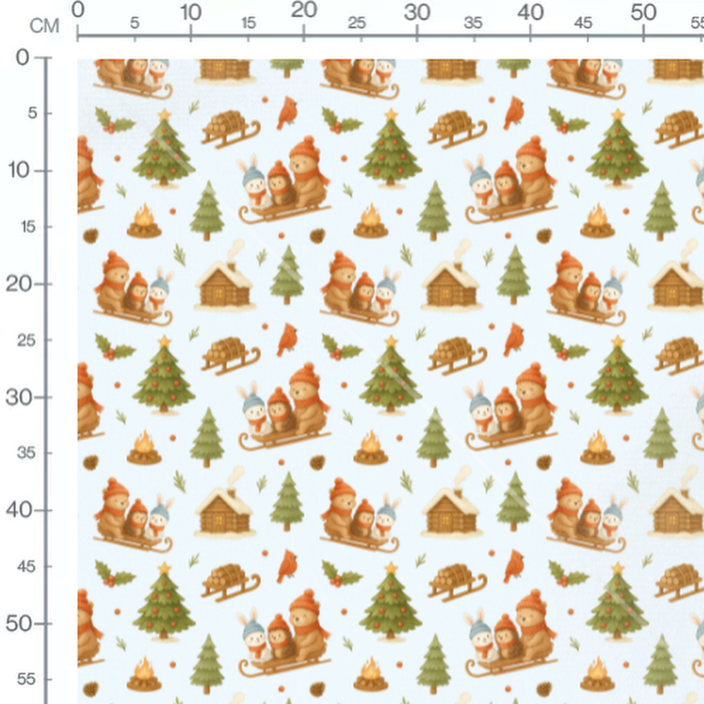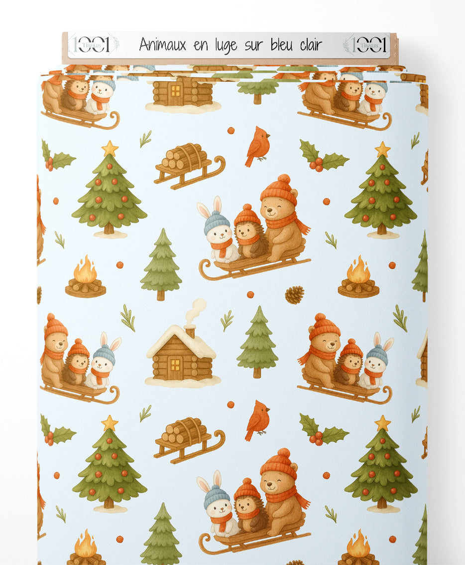 Des branches de houx et des pommes de pin ajoutent des détails naturels. Un traîneau chargé de bûches et une cabane enneigée renforcent l'ambiance hivernale. Les animaux portent des bonnets colorés, ajoutant une touche festive. Le cardinal rouge apporte une note vive au motif.Les tissus