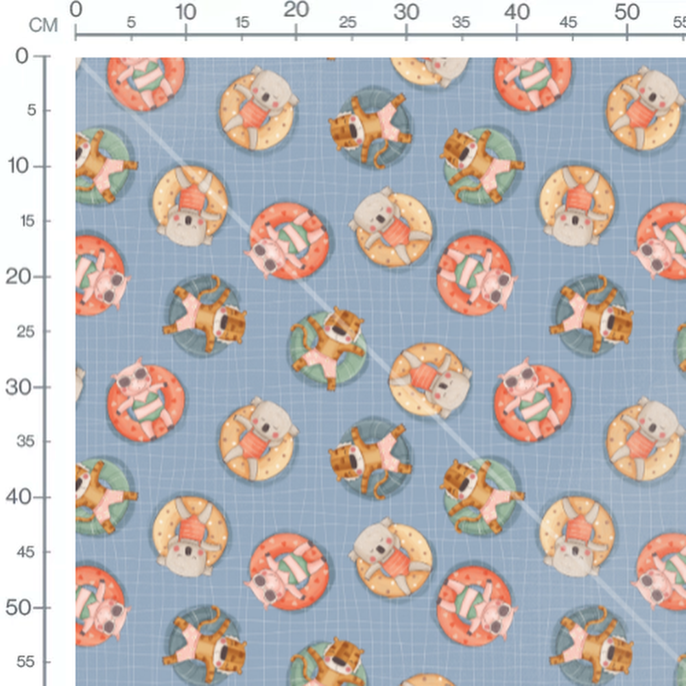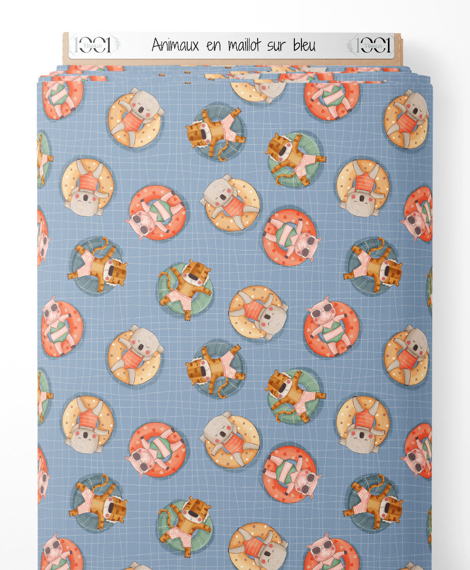 Les animaux incluent un éléphant, un tigre et un cochon portant des lunettes de soleil. Les bouées sont décorées de motifs simples et les animaux sont habillés de maillots rayés.Les tissus