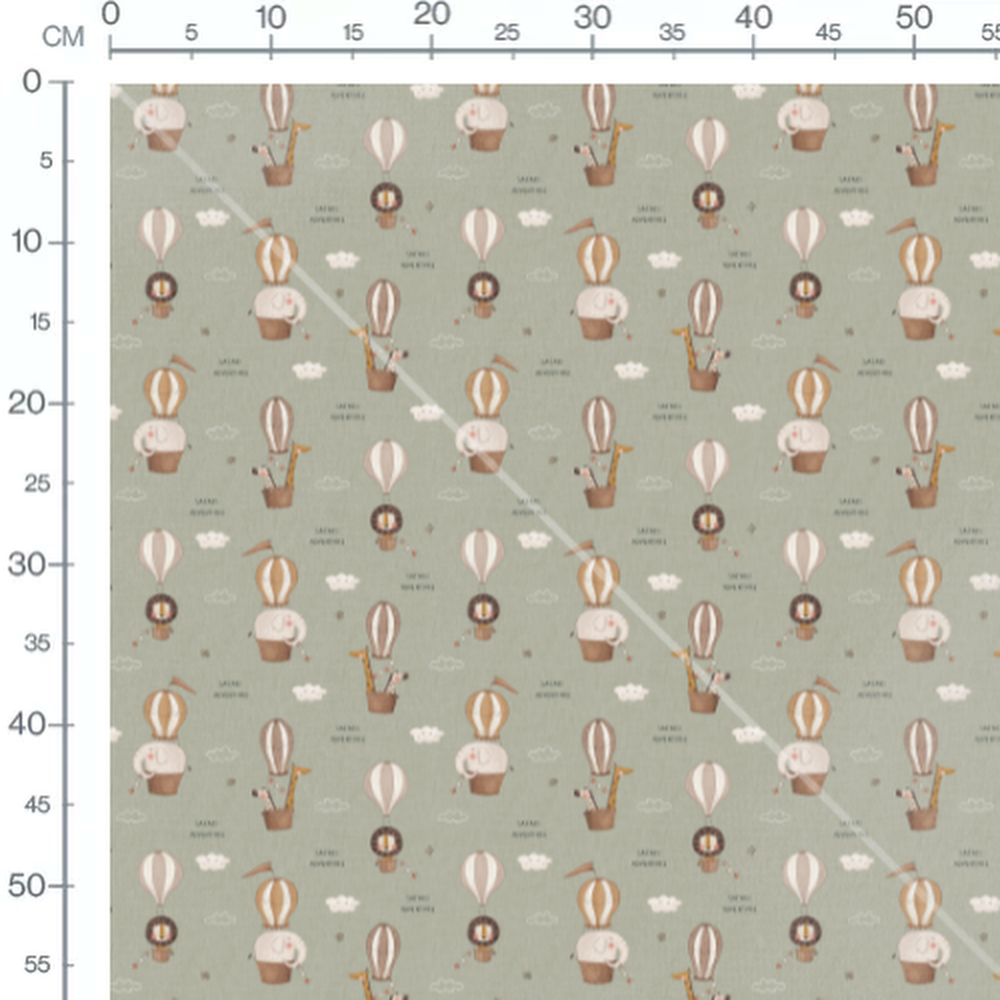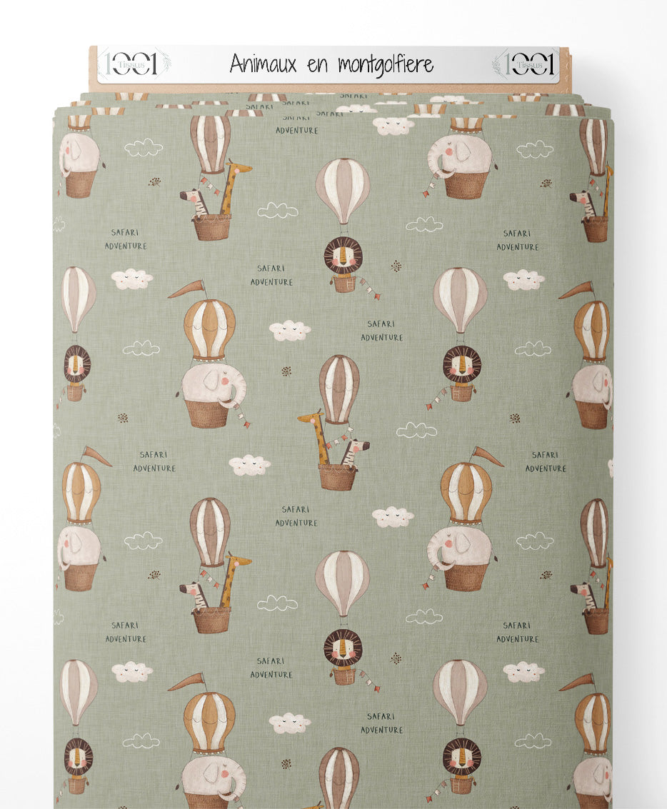 Les montgolfières sont marron et beige, transportant des animaux de safari. Les nuages sont petits et blancs, ajoutant une touche aérienne au motif.Les tissus