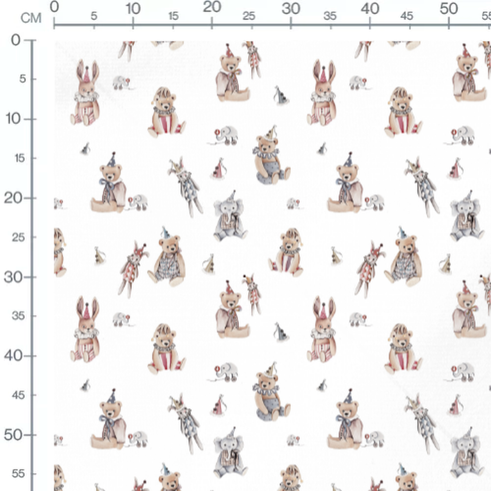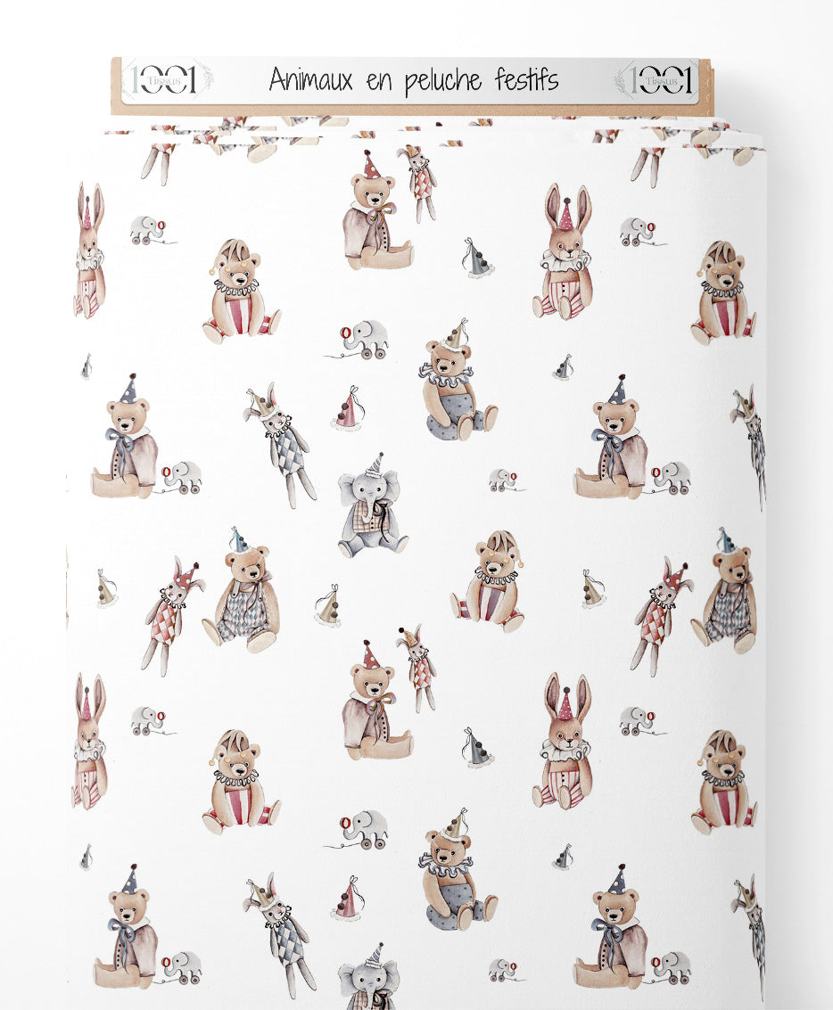 Les ours portent des chapeaux pointus et des vêtements à motifs. Les lapins sont habillés de rayures et de pois. Les éléphants sont accompagnés de petits jouets à roulettes.Les tissus