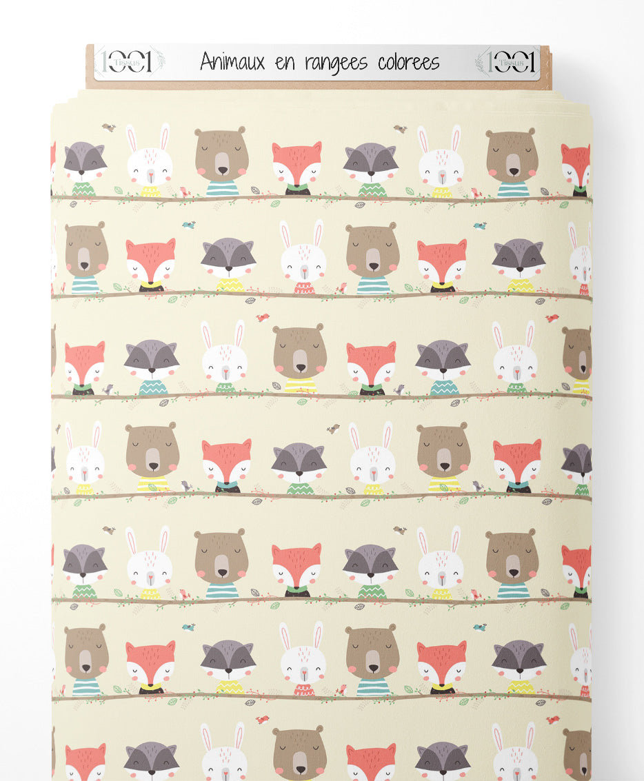Les renards portent des foulards jaunes, les ours des t-shirts rayés. Les ratons laveurs ont des pulls à motifs zigzag, et les lapins des colliers verts. De petites feuilles et branches complètent le motif.Les tissus