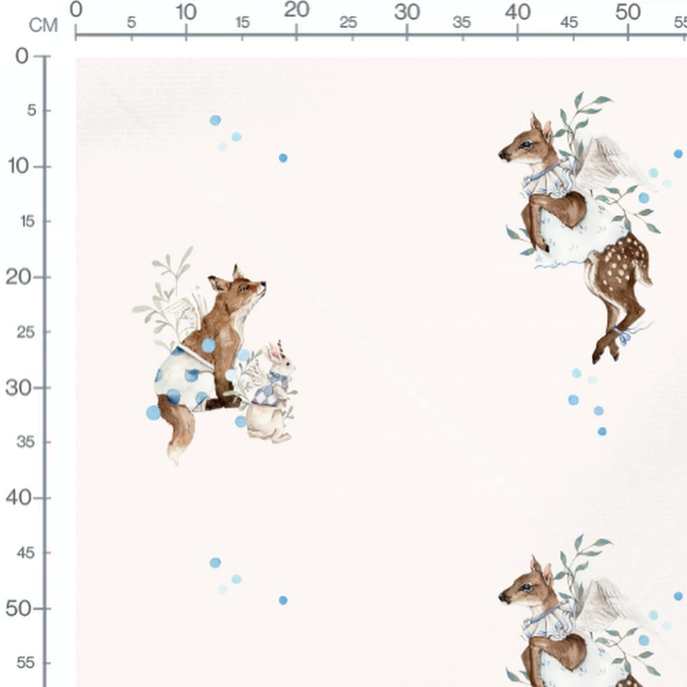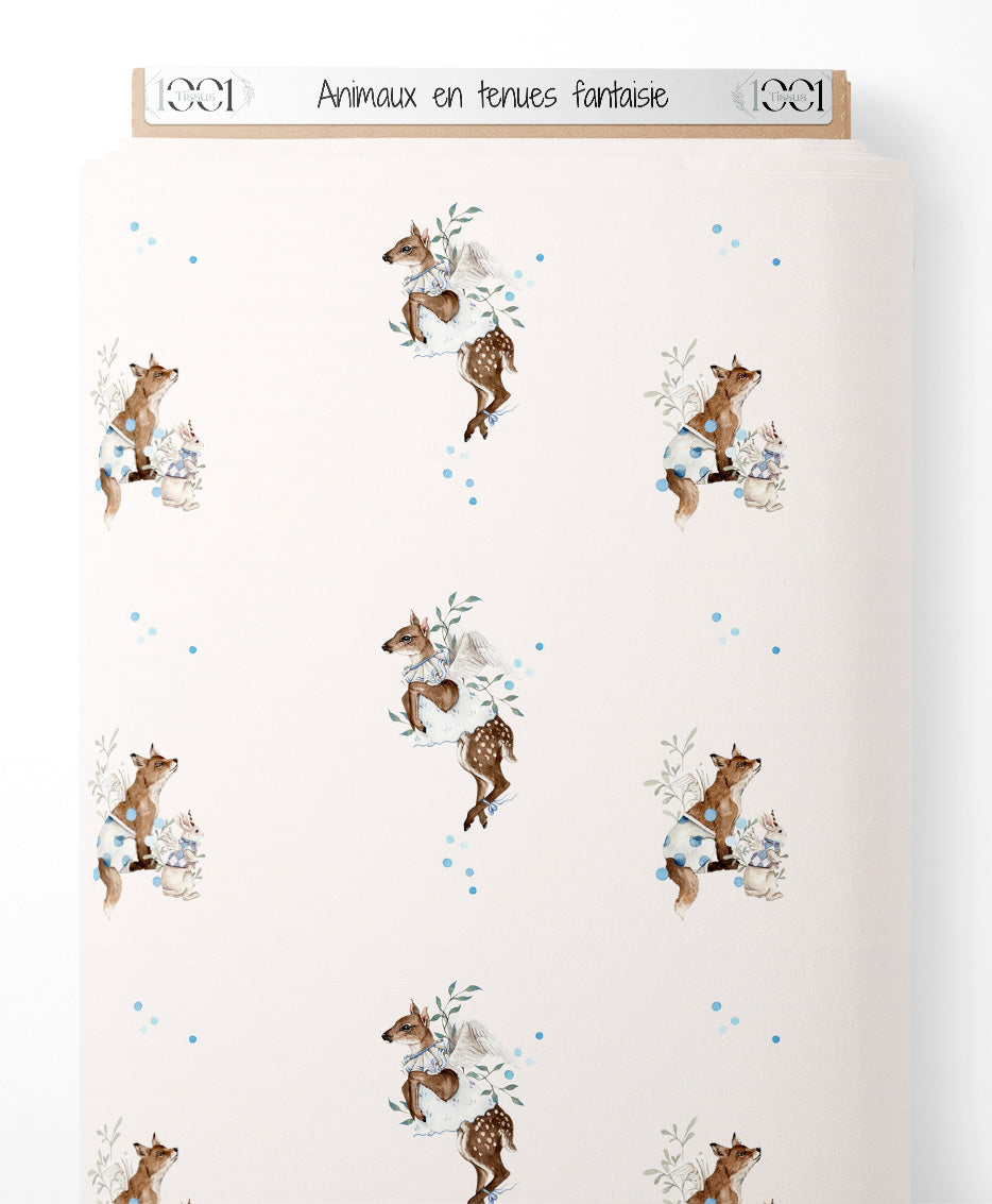 Le renard porte un vêtement à pois bleus et le lapin est habillé de rayures. Le faon a des ailes et est entouré de feuillages délicats. Des points bleus ajoutent une touche de couleur au fond blanc.Les tissus