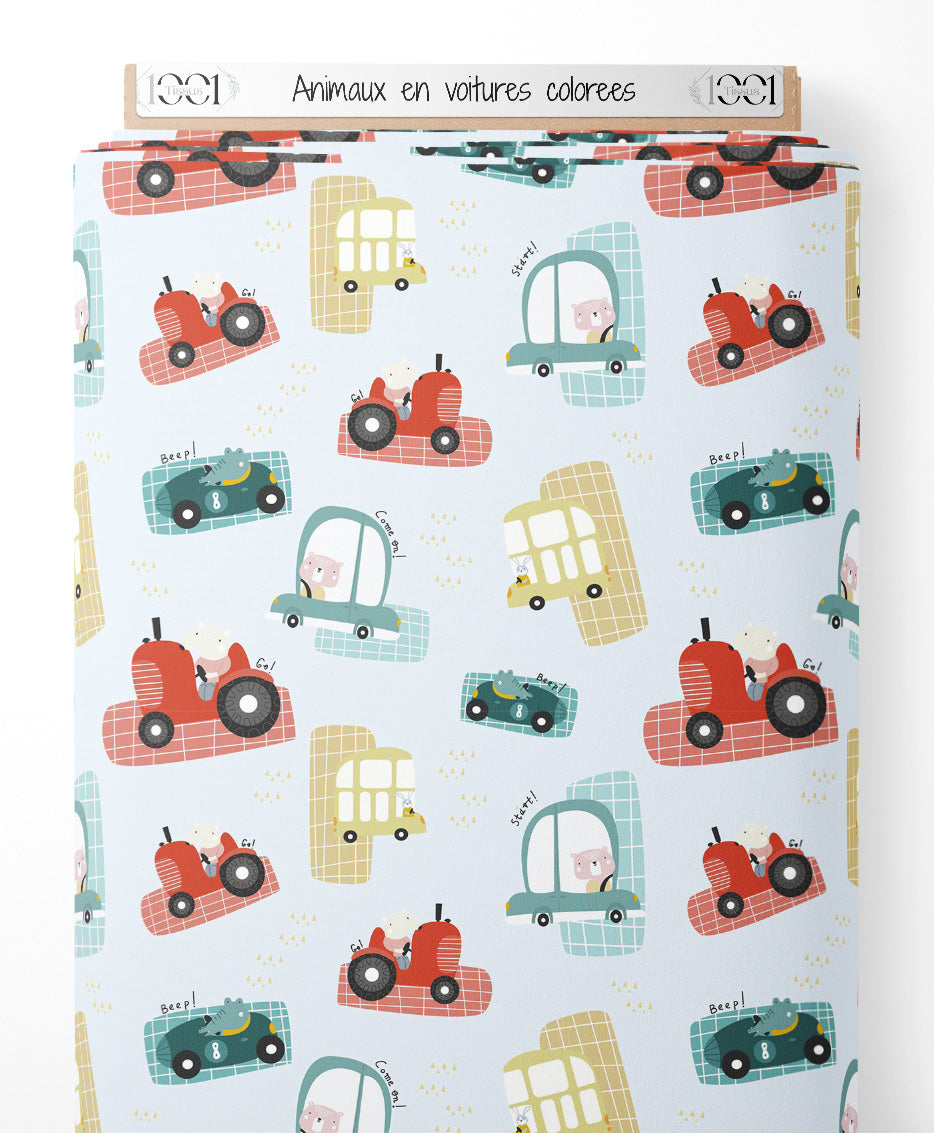 Les voitures rouges ont des animaux blancs avec des casques. Les voitures jaunes sont conduites par des animaux roses. Les voitures bleues ont des numéros et des animaux blancs.Les tissus