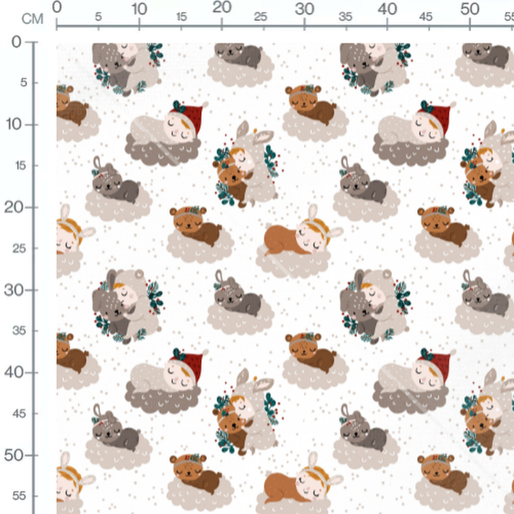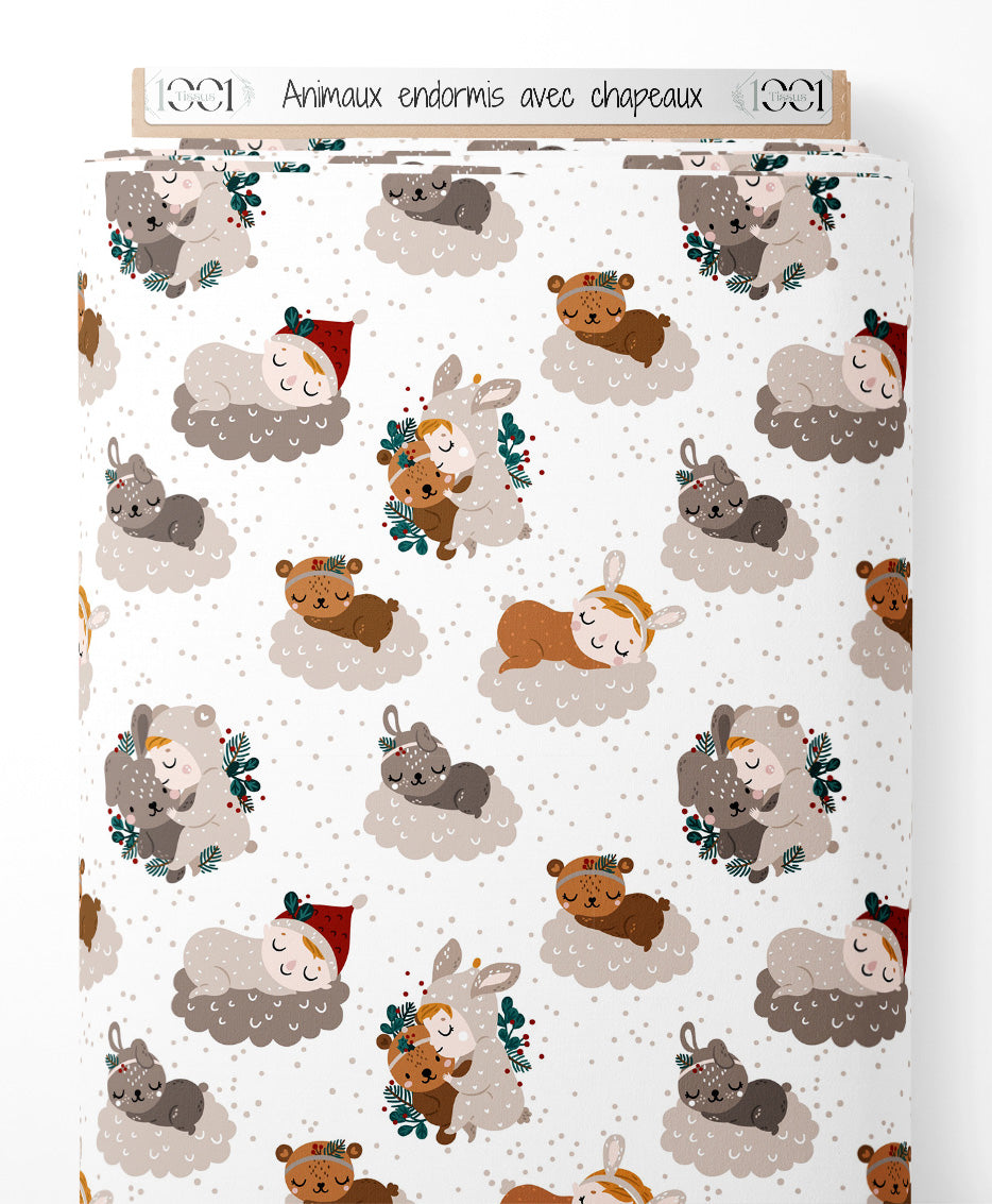 Les animaux portent des chapeaux rouges et dorment paisiblement. Des branches de sapin et des baies rouges accompagnent les motifs. Les nuages sont doux et moelleux, ajoutant une touche de rêve.Les tissus