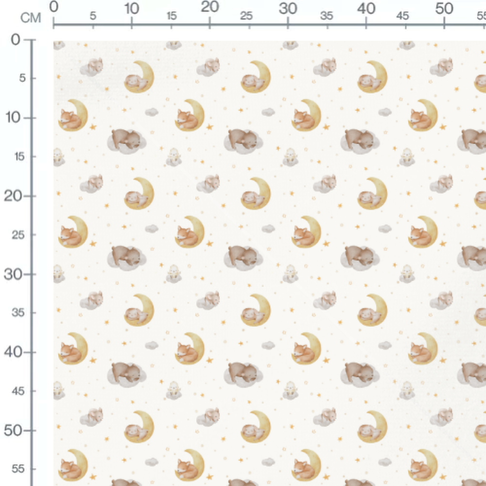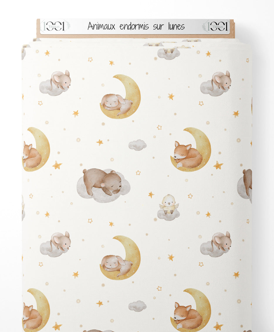 Un renard, un lapin et un ours sont paisiblement endormis sur des lunes et des nuages. Les lunes sont d'un jaune doux et les nuages sont gris clair. De petites étoiles jaunes ajoutent une touche de magie au motif.Les tissus