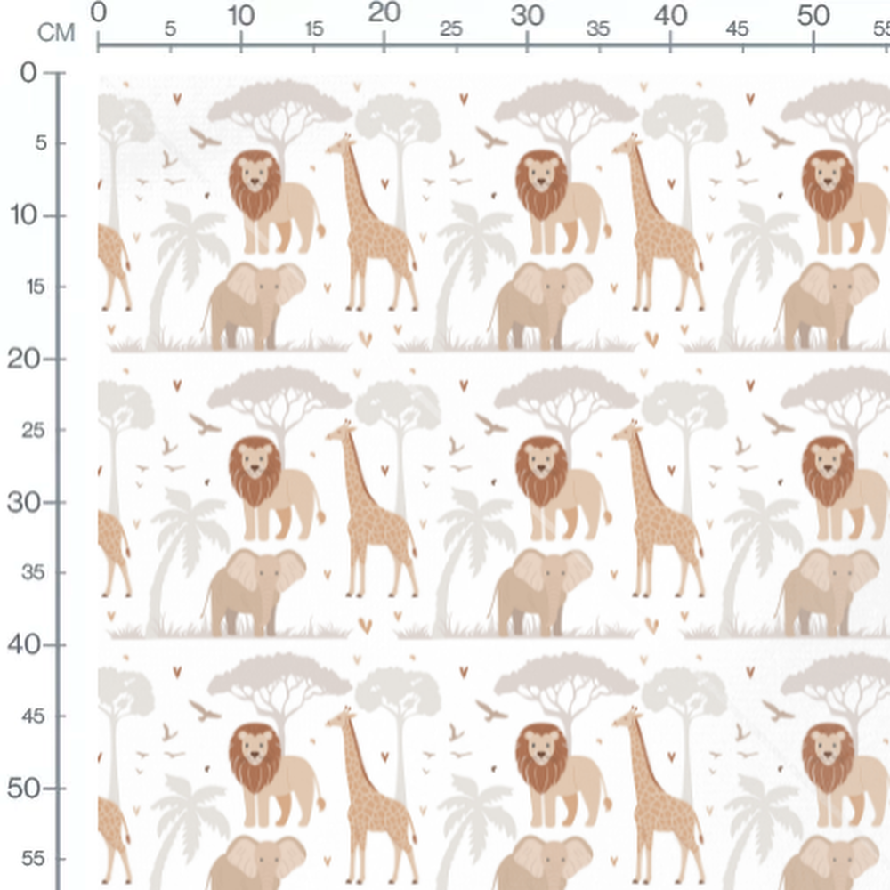 Les lions sont représentés avec une crinière marron. Les girafes ont un motif de taches marron clair. Les éléphants sont dessinés avec des oreilles larges et des défenses. Des arbres stylisés et des oiseaux en vol ajoutent au décor.Les tissus