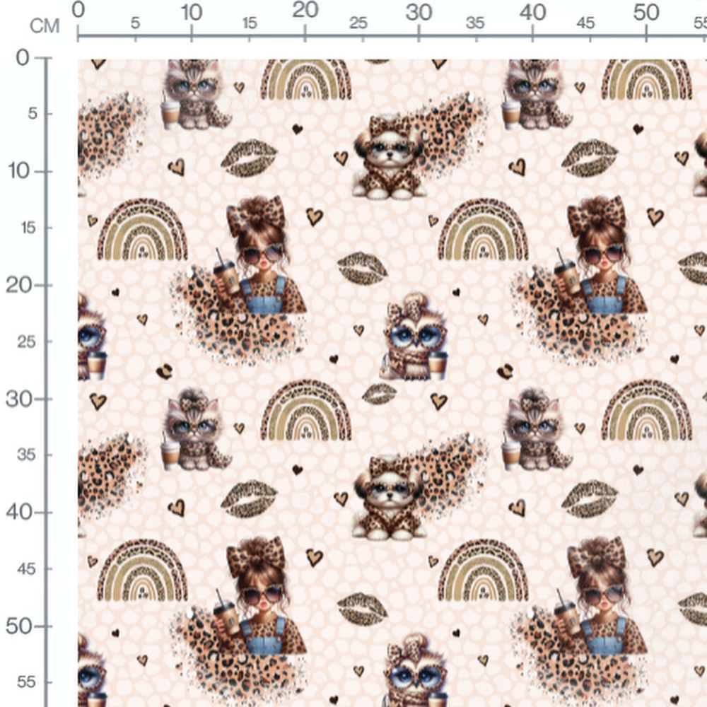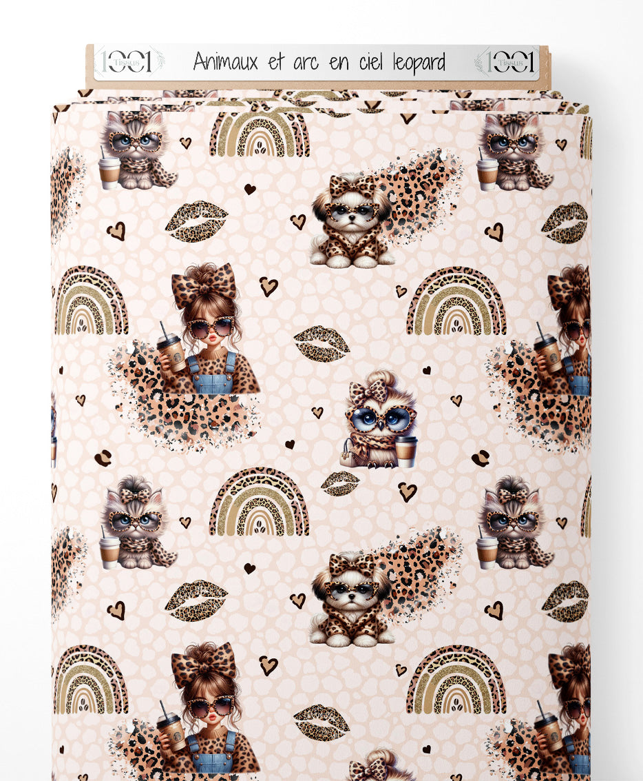 Les animaux portent des accessoires avec motifs léopard. La fille tient une boisson et porte des lunettes de soleil. Des lèvres et des cœurs complètent le motif.Les tissus