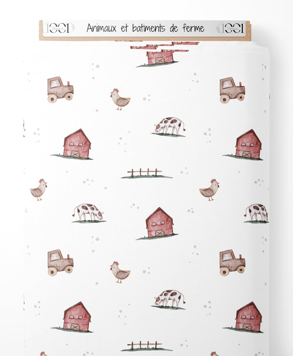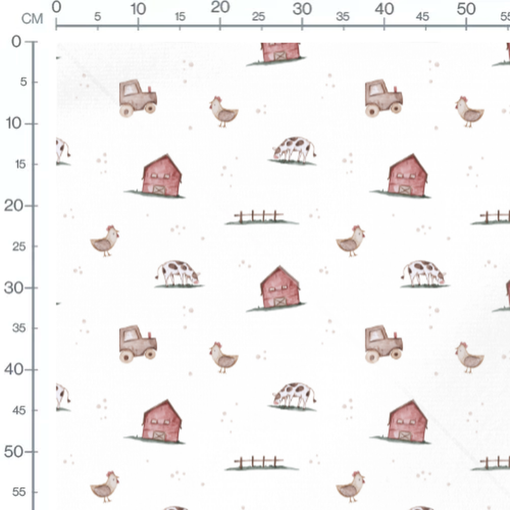 Les poules sont dessinées en marron clair avec des détails rouges. Les vaches présentent des taches marron foncé. Les tracteurs sont de couleur marron avec des roues beige. Les granges sont de couleur marron avec des toits rouges.Les tissus